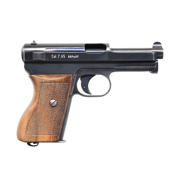 SEMI-AUTOMATIC PISTOL. Cal. 7.65mm. S# 536466. Bbl. 3 3/8". Model 1934 semi-automatic pistol mfg. by Mauser for commercial sales. Left side of the slide exhibits a milled panel with the full S#, followed by Mauser's mfg. information, with "Cal. 7,65 D.R.P.u.A.P." marked on the right. Sideplate is marked with the Mauser banner logo. Top of slide and right side of the forward bbl. lug exhibit a double crowned "U" commercial proof. Metal components exhibit a lustrous high polish salt blue finish overall. Frame is mounted with a 1-piece flat checkered wrap around wood grip. Fixed half-moon blade front sight, with dovetailed U-notch rear sight. All serialized parts are matching and include the frame, sideplate, slide, and bbl. MAGS: 1 8-rd. CONDITION: excellent, with metal components retaining bountiful amounts of their original factory salt blue finish, exhibiting a few spots of light to mild wear and thinning, a few superficial handling marks, as well as a couple of small spots of light to mild pitting present on the left side of the slide at the rear. Brilliant mirror bore, exhibiting well defined rifling throughout. Grip shows a few superficial marks from handling and storage, as well as a small chip and crack on the left side at the safety catch release button. A fine example of a commercial production Mauser Model 1934 pistol. PROVENANCE: the Estate Collection of Charles Wagner. (25-306/MLW). CURIO. $400-600.