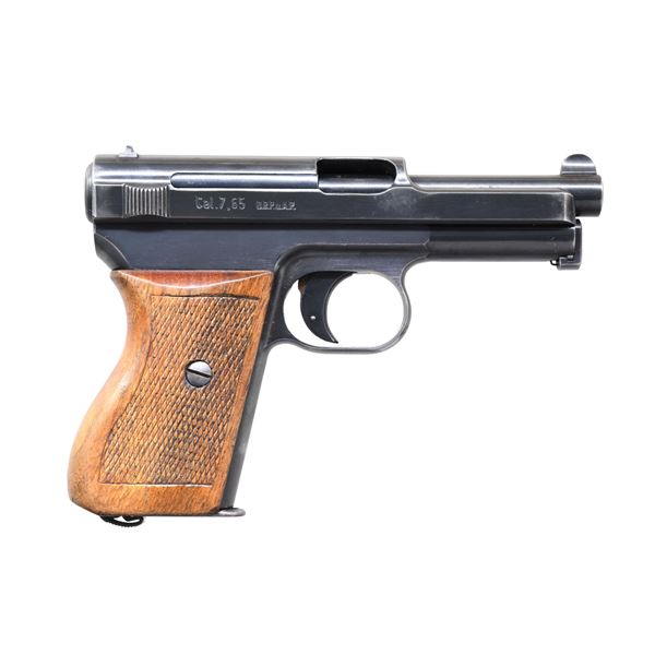 SEMI-AUTOMATIC PISTOL. Cal. 7.65mm. S# 596928. Bbl. 3 3/8". Model 1934 semi-automatic pistol mfg. by Mauser for commercial sales. Left side of the slide is marked with the S# within a milled panel, followed by Mauser's mfg. information, with "Cal. 7,65 D.R.P.u.A.P." marked on the right. Sideplate is marked with the Mauser banner logo. Top of the slide and right side of the front bbl. lug are marked with an Eagle/N commercial nitro proof. Metal components exhibit a lustrous high polish salt blue finish overall. Frame is mounted with a 1-piece flat checkered wood wrap around grip. Fixed half-moon blade front sight, with dovetailed U-notch rear sight. All serialized parts are matching and include the frame, sideplate, slide, and bbl. MAGS: 1 8-rd. CONDITION: metal components retain the majority of their original factory blue finish, exhibiting areas of wear and thinning that show through to gray patina, as well as some scattered pinprick spots of surface oxidation. Bright bore, exhibiting light to mild pitting, while retaining strong rifling throughout. Grip shows some superficial marks from handling and storage, but otherwise remains sturdy and serviceable. PROVENANCE: the Estate Collection of Charles Wagner. (25-308/MLW). CURIO. $300-500.