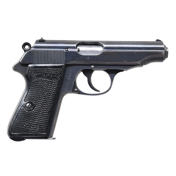 9MM KURZ SEMI-AUTOMATIC PISTOL WITH HEEL MAGAZINE RELEASE & HOLSTER. Cal. 9mm Kurz. S# 199725P. Bbl. 3 7/8". 1 of only approx. 1,500 9mm Kurz Model PP semi-automatic pistols mfg. by Walther for the German army during World War II. According to Rankin, these pistols were serialized within a 5,000 S# block, with Jan C. Still indicating that an estimated 1,500 were procured for the army from 1940-1945. The left side of the slide is marked with the Walther banner logo, followed by Walther's mfg. information, as well as the model and cal. designations. Left side of the frame and slide exhibit an Eagle/WaA359 acceptance proof. Right side of slide and bbl. exhibit a German Eagle/N commercial nitro proof. Metal components exhibit a blue finish overall, save for on the chamber, which is polished in-the-white. Frame is mounted with 2-piece Walther banner checkered black synthetic grips. Slide features a grooved rib, with a fixed blade front sight and dovetailed U-notch rear sight. Frame features a heel mag. release. Interior of slide is matching to the frame via the 3-digits of the S# "725", which are inscribed on the left slide wall, parallel to the ejection port. MAGS: 2 blued 7-rd. 1 mag. is blank, with the other marked with the Walther banner logo above "Cal. 9 m/m" on the left side. Unmarked mag. has been modified at one time, with a small half-circle cut made on the forward right edge of the body, a circular incision made on the left and right sides of the body, and with the right incision having been filled in. UNATTACHED ACCESSORIES: brown leather holster marked "hsy" on the rear of the belt loop. CONDITION: metal components retain the majority of their original factory blue finish, exhibiting some areas of light to mild wear and thinning, as well as scattered spots of light surface oxidation and pitting overall. Grip straps exhibit mild to moderate wear and thinning that shows through to a gray patina. Mirror bore, exhibiting a few scattered spots of light to mild pitting, while retaining well defined rifling throughout. Safety lever decocker functions appropriately when cycled by hand. Grips are very good, showing some smoothing, as well as a few superficial marks from handling and storage. Holster remains malleable, exhibiting some wear and some scattered marks from handling and storage. (24-6811/MLW). CURIO. $2,000-3,000.