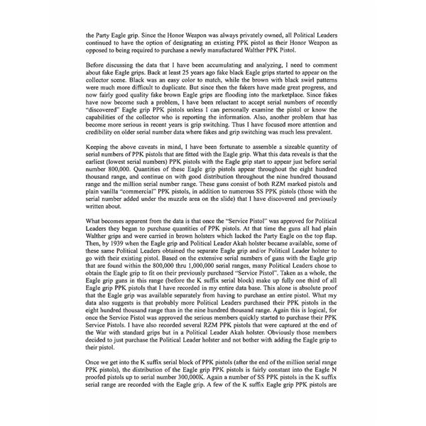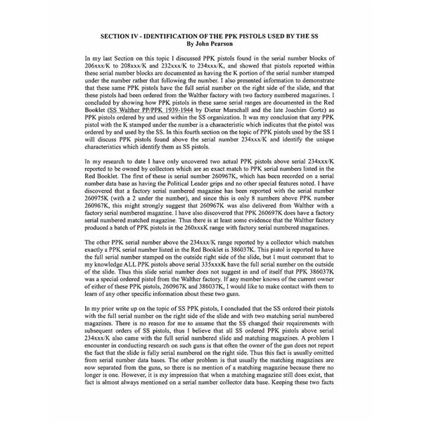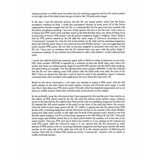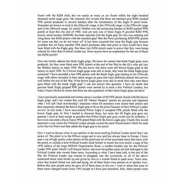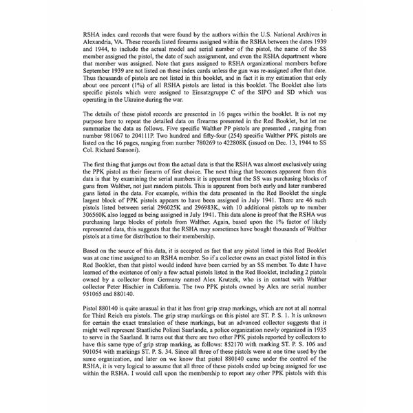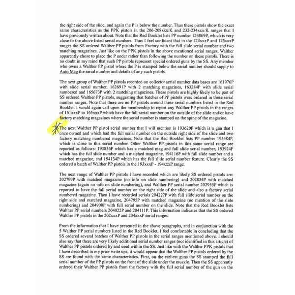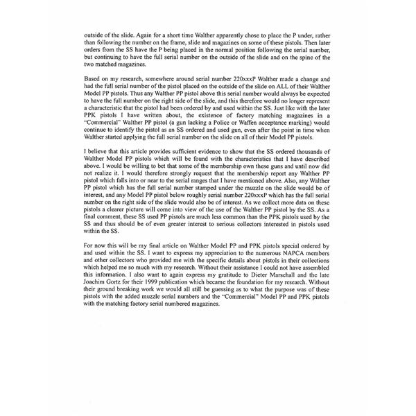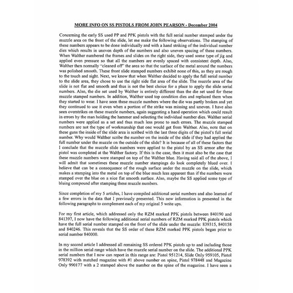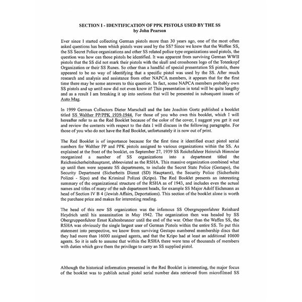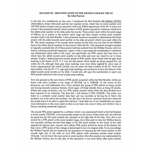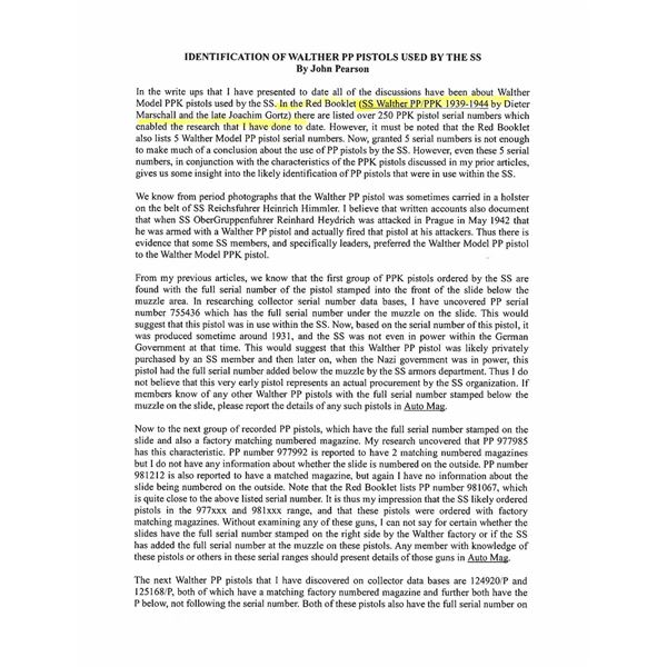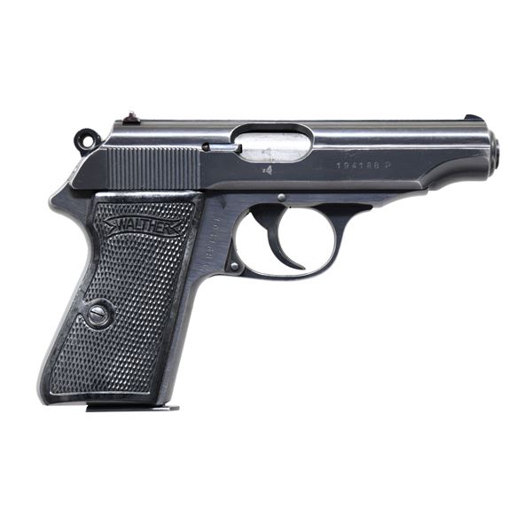 MODEL PP SEMI-AUTOMATIC PISTOL WITH DOCUMENTATION. Cal. 7.65mm. S# 194188P. Bbl. 3 7/8". 1 of only approx. 6,000 Model PP semi-automatic pistol mfg. by Walther under contract for the SS (Schutzstaffel). This example, mfg. in 1940, is listed by S# on page 97 of "SS Contract Walther PP/PPK Contract Variations & Serial Numbers" by Thomas Whiteman. The left side of the slide is marked with the Walther banner logo, followed by markings stipulating Walther's mfg. information, as well as the model and cal. designations. Right side of the frame (on chamber), slide, and bbl. exhibit an Eagle/N commercial nitro proof. Metal components exhibit a high polish blue finish overall, save for on the chamber area, which is polished in-the-white. Frame is mounted with 2-piece Walther banner checkered black synthetic grips. Matte grooved rib, with fixed blade front sight and dovetailed U-notch rear sight. Slide matches the frame, via the full S# on the right side. MAGS: 1 spuriously matching 8-rd. mag. ("Comments/Condition" section in book lists, "97% high polish, no MM". UNATTACHED ACCESSORIES: a 1999 copy of the "SS Walther PP/PPK 1939-1944" by Joachim Gortz & Diet H. Marschall, as well as a copy of John P. Pearson's article on the SS contract Walther PP/PPK pistols. CONDITION: very good, with metal components retaining bountiful amounts of their original factory high polish blue finish, exhibiting some areas of light to mild wear, with scattered superficial handling marks present overall. Grip straps exhibit scattered spots of light surface oxidation. Mirror bore, exhibiting a few spots of light pitting, while retaining well defined rifling throughout. Grips show mild smoothing and some superficial marks from handling and storage, but otherwise remain sturdy and serviceable. A scarce, documented, and high condition example of an SS contract Walther Model PP pistol. PROVENANCE: the Estate Collection of Charles Wagner. (25-318/MLW). CURIO. $1,500-2,500.