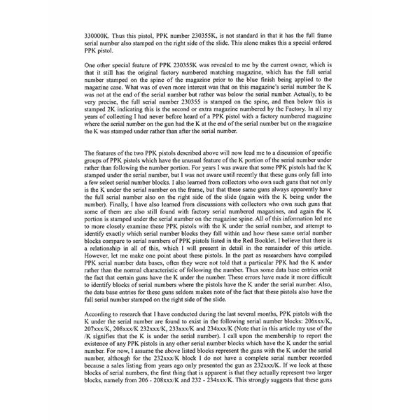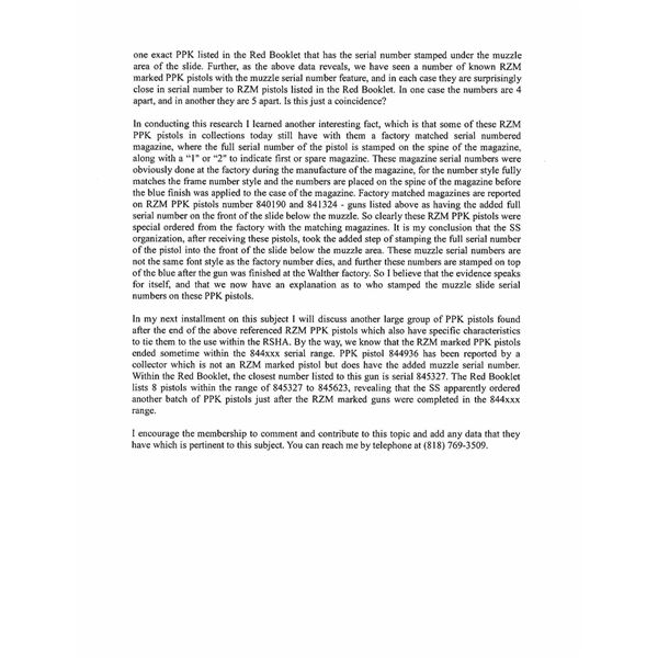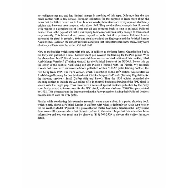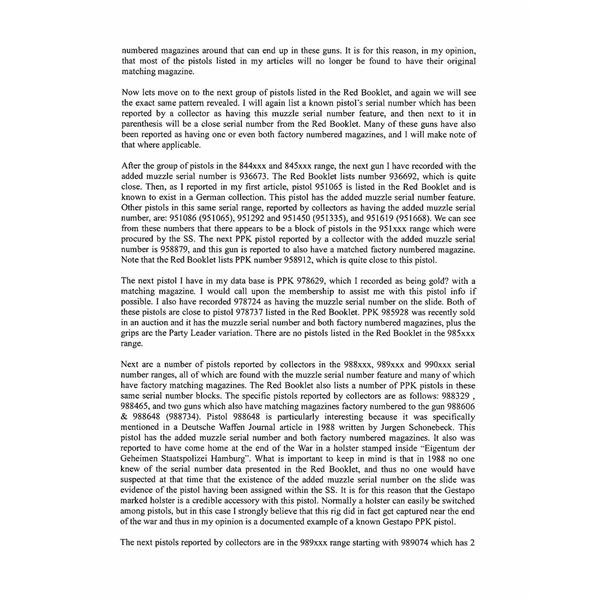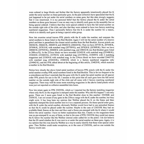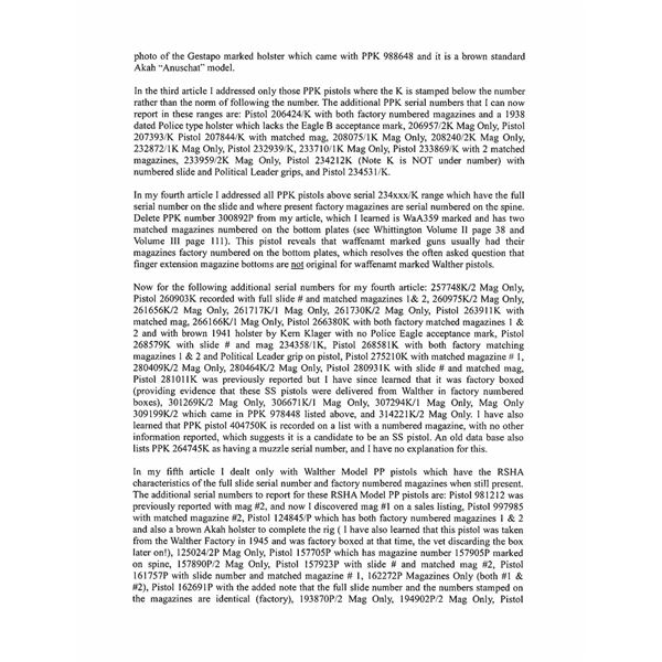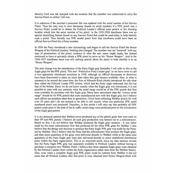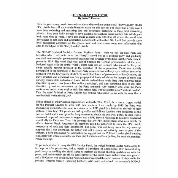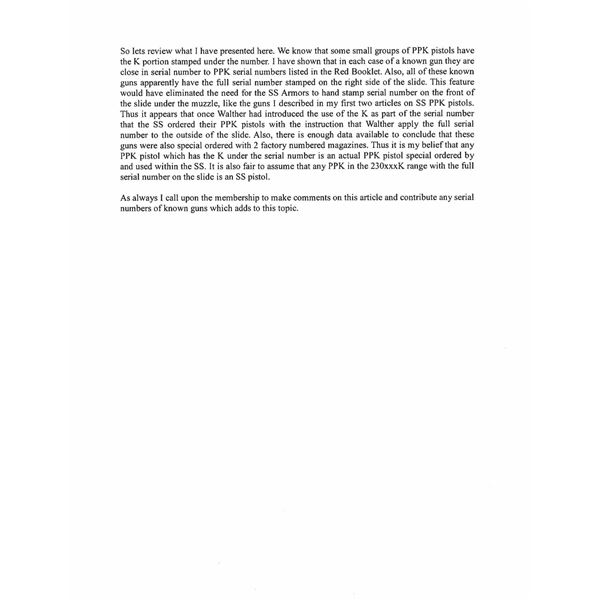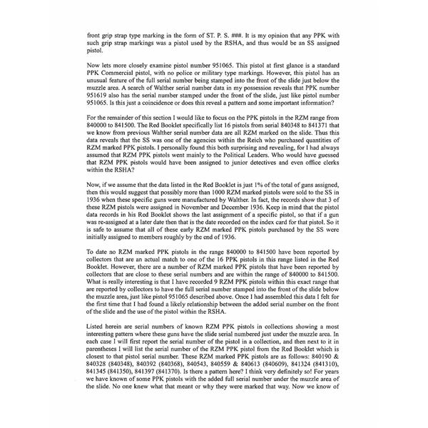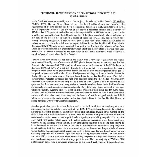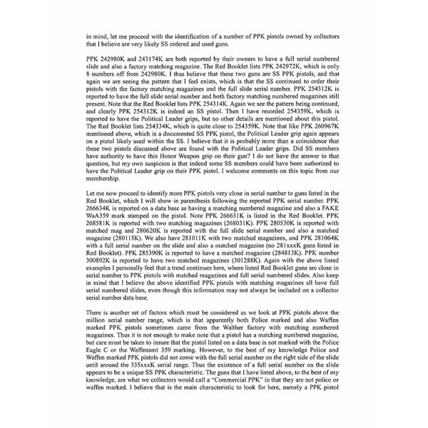 MODEL PP SEMI-AUTOMATIC PISTOL WITH DOCUMENTATION. Cal. 7.65mm. S# 194188P. Bbl. 3 7/8". 1 of only approx. 6,000 Model PP semi-automatic pistol mfg. by Walther under contract for the SS (Schutzstaffel). This example, mfg. in 1940, is listed by S# on page 97 of "SS Contract Walther PP/PPK Contract Variations & Serial Numbers" by Thomas Whiteman. The left side of the slide is marked with the Walther banner logo, followed by markings stipulating Walther's mfg. information, as well as the model and cal. designations. Right side of the frame (on chamber), slide, and bbl. exhibit an Eagle/N commercial nitro proof. Metal components exhibit a high polish blue finish overall, save for on the chamber area, which is polished in-the-white. Frame is mounted with 2-piece Walther banner checkered black synthetic grips. Matte grooved rib, with fixed blade front sight and dovetailed U-notch rear sight. Slide matches the frame, via the full S# on the right side. MAGS: 1 spuriously matching 8-rd. mag. ("Comments/Condition" section in book lists, "97% high polish, no MM". UNATTACHED ACCESSORIES: a 1999 copy of the "SS Walther PP/PPK 1939-1944" by Joachim Gortz & Diet H. Marschall, as well as a copy of John P. Pearson's article on the SS contract Walther PP/PPK pistols. CONDITION: very good, with metal components retaining bountiful amounts of their original factory high polish blue finish, exhibiting some areas of light to mild wear, with scattered superficial handling marks present overall. Grip straps exhibit scattered spots of light surface oxidation. Mirror bore, exhibiting a few spots of light pitting, while retaining well defined rifling throughout. Grips show mild smoothing and some superficial marks from handling and storage, but otherwise remain sturdy and serviceable. A scarce, documented, and high condition example of an SS contract Walther Model PP pistol. PROVENANCE: the Estate Collection of Charles Wagner. (25-318/MLW). CURIO. $1,500-2,500.
