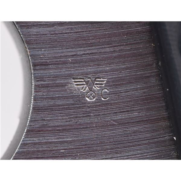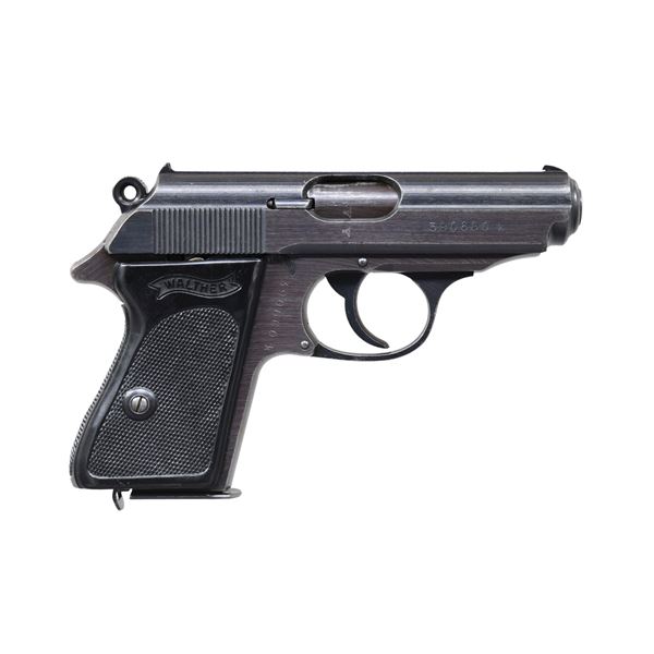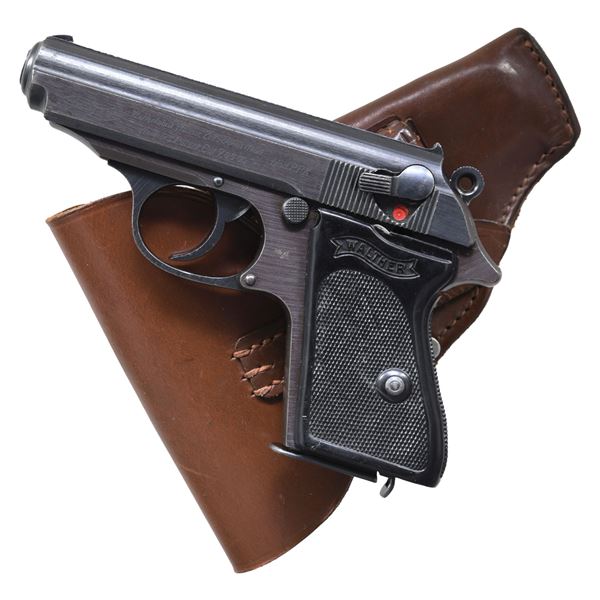 SEMI-AUTOMATIC PISTOL WITH HOLSTER. Cal. 7.65mm. S# 390660K. Bbl. 3 1/4". Model PPK semi-automatic pistol mfg. by Walther for German police use between 1938-1945. Left side of the slide is marked with the Walther banner logo, followed by markings stipulating Walther's mfg. information, as well as the model and cal. designations. Left side of the frame is marked with a German police Eagle/C proof, with the S# marked on the right. Right side of the slide, chamber, and bbl. exhibit a German Eagle/N commercial nitro proof. Metal components exhibit a dull military blue finish overall. Frame is mounted with a 1-piece Walther banner checkered black synthetic wrap around grip. Fixed blade front sight, with fixed U-notch rear sight. Matching numbers are present on the right side of the frame and slide. MAGS: 2 blued 7-rd. UNATTACHED ACCESSORIES: brown leather holster marked "ROBERT LARSEN/ BERLIN/ SW68/ 1939" above a German eagle party insignia. CONDITION: very good, with metal components retaining the majority of their original arsenal blue finish, exhibiting some areas of light to mild wear and thinning that show through to gray patina, some light superficial handling marks, as well as some scattered spots of light to mild surface oxidation and pitting. Mirror bore, exhibiting well defined rifling throughout. Grip shows some smoothing, as well as some scattered marks from handling and storage. Holster remains malleable, exhibiting some minor wear and marks from handling and storage. A nice example of a Eagle/C police proofed Walther Model PP pistol. (24-6776/MLW). CURIO. $1,500-2,500.