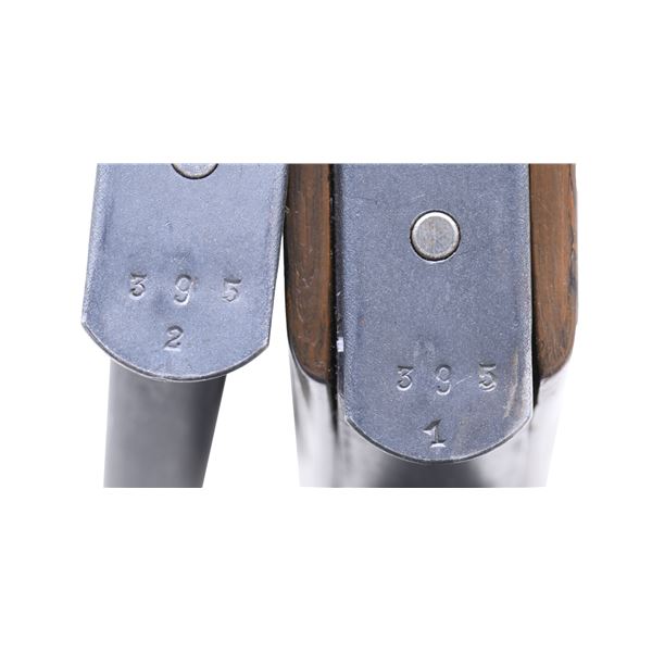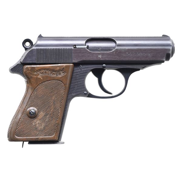 PPK SEMI-AUTOMATIC PISTOL WITH TWO MATCHING MAGAZINES. Cal. 7.65mm. S# 362395k. Bbl. 3 1/4". Model PPK semi-automatic pistol mfg. by Walther in 1942 for police use. The left side of the slide is marked with the Walther banner logo, followed by additional markings stipulating Walther's mfg. information, as well as the model and cal. designations. Left side of the frame is marked with an Eagle/C police proof. Right side of the frame (on chamber), slide, and bbl. exhibit a German Eagle/N commercial nitro proof. Metal components exhibit a dull military blue finish overall. Frame is mounted with a 1-piece mottled brown Walther banner checkered synthetic grip. Fixed blade front sight, with fixed U-notch rear sight. All serialized parts are matching and include the frame and slide. MAGS: 2 matte blue finished mags., matching via "395/ 1" and "395/ 2" on the floorplates. CONDITION: very good, with metal components retaining bountiful amounts of their original factory blue finish overall, exhibiting mild wear on the forward edges of the slide, with some light thinning present on the frame spur. Brilliant mirror bore, exhibiting well defined rifling throughout. Grip shows some light smoothing, as well as some scattered superficial marks from handling and storage, with the right side exhibiting some light exterior cracking on the top left corner. PROVENANCE: the Estate Collection of Charles Wagner. (25-327/MLW). CURIO. $1,500-2,500.
