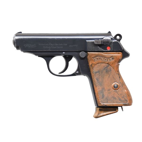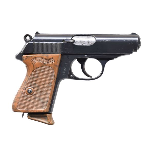 PISTOL. Cal. 22 LR. S# 862882. Bbl. 3 1/4". PPK semi-automatic pistol chambered in .22 LR mfg. by Walther in 1935. The left side of the slide is marked with the Walther banner logo, followed by markings stipulating Walther's mfg. information, as well as the model and cal. designations. Right side of the frame (on chamber), slide, and bbl. exhibit a Crown/N commercial nitro proof. Metal components exhibit a blue finish overall, save for on the chamber area, which is polished in-the-white. Frame is mounted with a 1-piece mottled brown Walther banner checkered synthetic wrap around grip. Slide features a matte grooved rib, with a fixed blade front sight and fixed U-notch rear sight. Interior of the slide is numbered "XX2", parallel to the ejection port. MAGS: 1 unmarked matte blue 10-rd. mag., with mottled brown synthetic grip extension. CONDITION: metal components retain the majority of their original factory blue finish, exhibiting some spots of light to mild wear and thinning, some scattered spots of light surface oxidation, as well as some scattered spots of mild pitting. Mirror bore, retaining strong rifling throughout. Grip show mild age related warping, light smoothing, as well as some scattered marks from handling and storage, with a small crack present on the left rear edge of the grip. (24-7204/MLW). CURIO. $500-800.