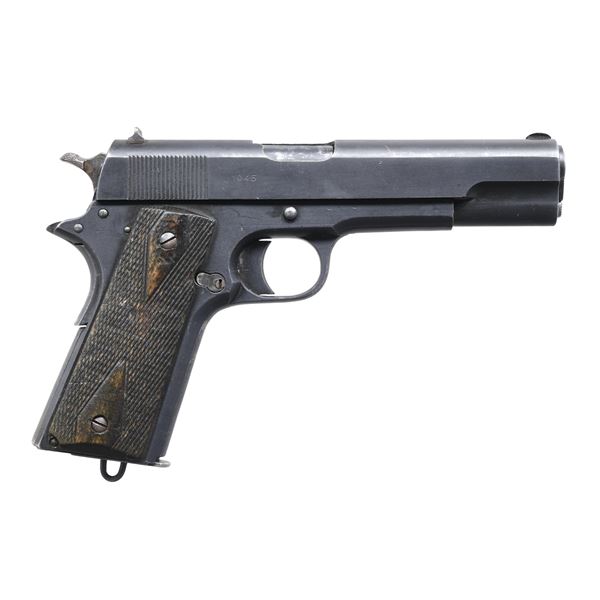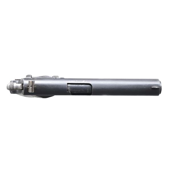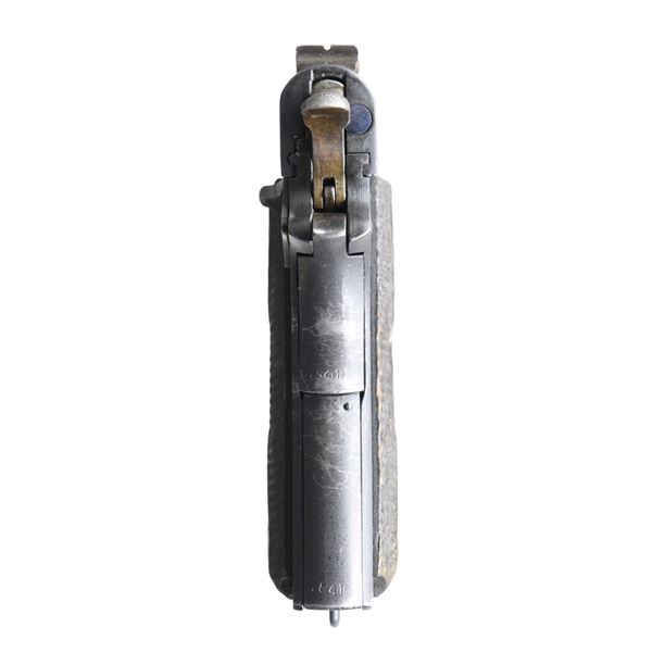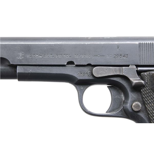 657(n) SEMI AUTO PISTOL WITH BROWN HOLSTER. Cal. 11.25mm (45 ACP). S# 29841 (1945). In June 1940, the Kongsberg factory was commandeered by invading German forces. During 1945, The Germany Army Weapons Office ordered production of pistols in preparation for an Allied invasion of Norway. The Norwegian Model 1914 pistol was given the designation of the Pistole 657(n) & mfg. under German supervision. Per "Colt .45 Government Models (Commercial Series)" by Charles Clawson, "921 were Nazi proofed in the serial number range from 29615 to 30535". All correct parts have matching frame S# including 5" barrel having German firing proof on lug & Jorgen Bjornholt proof. Slide with correct Kongsberg crest (used from 1945-1947), German Waffenamt, dated "1945" & stamped with dot & "F" behind rear sight. Frame & barrel stamped with script "JB" proof on triggerguard; Jorgen Bjornholt was a civilian sub-inspector forced into to be control officer by the Germans. Two piece checkered birch grips. MAGS: 2 phosphate finished 7 rd. with lanyard rings. UNATTACHED ACCESSORIES: brown leather holster ink marked "P657N" on flap. CONDITION: very good. Over 90% original phosphate finish on barrel, slide & frame showing scattered small areas of worn finish & light scratches. Good grips with areas of flattened diamonds and scratches. Good bore with light frosting & wear to lands. (24-6893/MD). CURIO. $3,000-4,000.