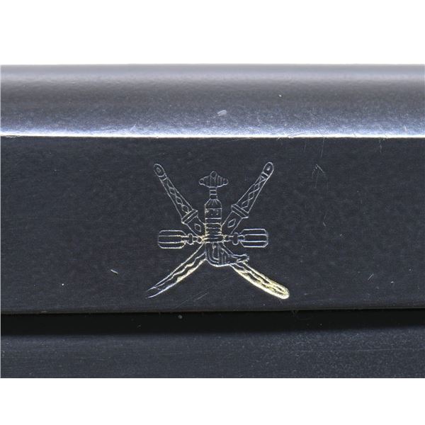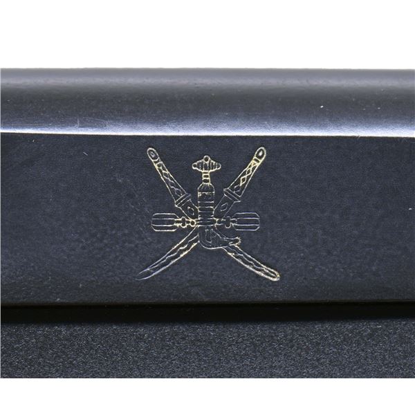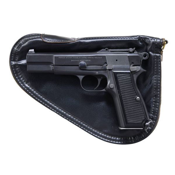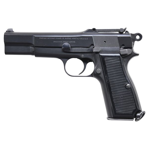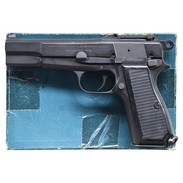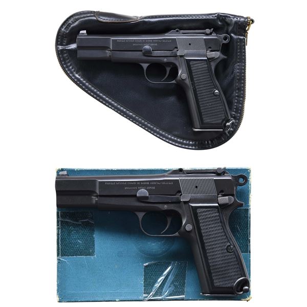 HIGH POWER PISTOLS, FIRST VARIATION SALES SAMPLES. In 1969, a Mr. Paul Van Hee was told of Omani interest in FN High Power pistols. Although he was not a representative of FN, sensing a business opportunity, he purchased a number of High Power pistols in 9mmP and marked them in the US with the Omani crest to use as sales samples. The first nine pistols were marked with an error in the Crest; the subsequent 27 pistols had the corrected crest. 1) Cal. 9mmP (9mm Luger). S# T152256. This pistol, with tangent sight, slotted frame, and ring hammer, was finished in black enamel. The left side of the slide was marked with the late two line FN address. The right side of the pistol has the usual Belgian proofs and stacked serial numbers on the barrel, slide, and frame. The lightly stamped Omani crest has the incorrectly rotated dagger whose sheath is pointed to the right. Fitted with black plastic bordered grips, the left panel recessed for the lanyard ring. MAGS: 1 Inglis WWII 13-rd. mag. UNATTACHED ACCESSORIES: accompanied by a 1960s vintage Browning pouch of black vinyl, lined in red felt, and closed with a brass zipper. CONDITION: 99% of the original painted finish remains with a few small areas of scuffing on the slide release and front strap. Comparable condition grips and magazine. Bright bore with sharp rifling. Hammer release is sluggish, likely due to congealed grease. Near excellent pouch. (25-1629/LMA). 2) Cal. 9mmP. (9mm Luger). S# T152257. This pistol, with tangent sight, round hammer, and slotted frame, was finished in black enamel. The left side of the slide was marked with the late two line FN address. The right side of the pistol has the usual Belgian proofs and stacked serial numbers on the barrel, slide, and frame. The lightly stamped Omani crest has the incorrectly rotated dagger whose sheath is pointed to the right. Fitted with black plastic bordered grips, the left panel recessed for the lanyard ring. MAGS: 1 Inglis WWII 13-rd. mag. UNATTACHED ACCESSORIES: accompanied by a green FN logo shipping box hand-numbered to pistol with instruction booklet and cleaning rod. Just a few SNs away from the example pictured in "The FN Browning Pistols" book by VanderLinden, 3rd edition, Vol 2, pg 786. CONDITION: 99+% of the original painted finish remains with a few miniscule areas of scuffing on the front strap. Comparable condition grips and magazine. Mirror bore. Correct manual mechanics. Very good box and booklet with shelf wear, tape on lid. PROVENANCE: the Estate Collection of Charles Wagner. (25-1630/LMA). BOTH CURIO. $4,000-6,000.