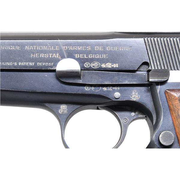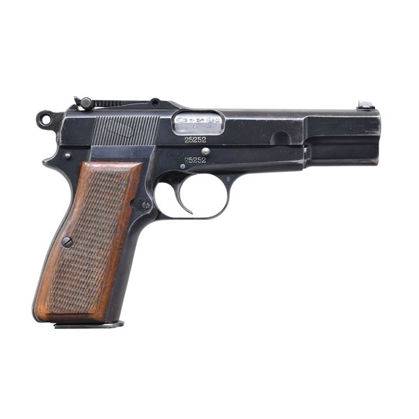 CONTRACT HIGH POWER SEMI-AUTOMATIC PISTOL, WITH TANGENT REAR SIGHT. Cal. 9mm Luger. S# 25252. Bbl. 4 5/8". High Power semi-automatic pistol mfg. in Belgium by Fabrique Nationale under contract for the Belgian military in May of 1939. The left side of the slide is marked "FABRIQUE NATIONALE D'ARMES DE GUERRE/ HERSTAL BELGIQUE/ BROWNING'S PATENT DEPOSE", with Belgian military proofs marked on the left side of the frame, slide, and right side of bbl. Metal components exhibit a blue finish overall, save for on the bbl., which is polished in-the-white. Frame is mounted with 2-piece checkered wood grips, which feature red anti-moisture barrier paint on the interior of the panels. Dovetailed blade front sight, with V-notch tangent rear sight graduated 50-500. Thumbprint slide, with slotted back strap for a stock attachment. All serialized parts are matching and include the frame, slide, and bbl. MAGS: 1 Belgian military accepted 13-rd. mag., with encircled "H" proof on spine. Body features a parkerized finish, with the split tail floorplate exhibiting a blue finish. CONDITION: very good, with metal components retaining the majority of their original blue finish, exhibiting some areas of light to mild wear and thinning that show through to gray patina, some superficial marks from handling, storage, and disassembly, as well as some scattered spots of light surface oxidation. Grip straps retain the majority of their blue finish, exhibiting consistent light to mild surface oxidation. Brilliant mirror bore, retaining well defined rifling throughout. Grips show mild smoothing and some superficial marks from handling and storage, but otherwise remain sturdy and serviceable. PROVENANCE: the Estate Collection of Charles Wagner. (25-257/MLW). CURIO. $1,750-2,250.
