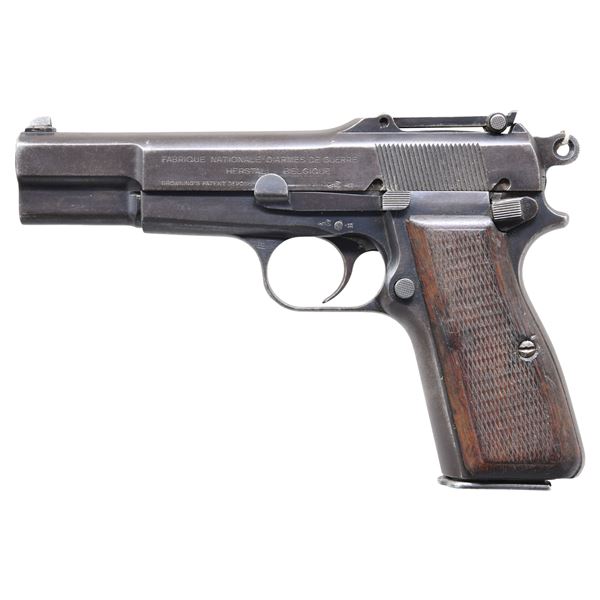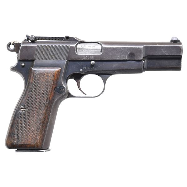 POWER SEMI-AUTOMATIC PISTOL. Cal. 9mm Luger. S# 20168. Bbl. 4 5/8". High Power semi-automatic pistol mfg. in Belgium by Fabrique Nationale in December of 1938. While not bearing any identifying proofs, the Chinese High Power contract S#s range from approx. 6,000-9,500 and 9,500-11,000, with the final shipment incorporating a contract S# starting at 20,000, as referenced on page 721 of the 3rd edition "FN Browning Pistols, Vol. II" by Anthony Vanderlinden. The left side of the slide is marked "FABRIQUE NATIONALE D'ARMES DE GUERRE/ HERSTAL BELGIQUE/ BROWNING'S PATENT DEPOSE". Underside of slide (on the recoil mainspring housing) is KFS import marked. Left side of the frame, slide, and right side of the bbl. exhibit Belgian commercial proofs. Metal components exhibit a blue finish overall, save for on the bbl., which is polished in-the-white. Frame is mounted with 2-piece checkered wood grips. Thumbprint slide, with dovetailed blade front sight and V-notch tangent rear sight, graduated 50-500. Back strap on frame is slotted for a stock attachment. All serialized parts are matching and include the frame, slide, and bbl. MAGS: 1 13-rd. Belgian proofed mag., with phosphate finished body and blued split tail floorplate. CONDITION: metal components retain large amounts of their original blue finish, exhibiting areas of wear and thinning that show through to gray patina, as well as scattered areas of light to mild surface oxidation and pitting overall. Bore is bright, exhibiting consistent mild pitting, while retaining well defined rifling throughout. Grips show smoothing, as well as scattered marks and impressions from handling and storage, but otherwise remain sturdy and serviceable. PROVENANCE: the Estate Collection of Charles Wagner. (25-264/MLW). CURIO. $1,200-1,800.