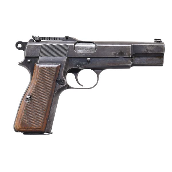 SEMI-AUTOMATIC PISTOL, WITH TANGENT REAR SIGHT. Cal. 9mm Luger. S# 119774. Bbl. 4 5/8". High Power semi-automatic pistol mfg. in Belgium by Fabrique Nationale while under German occupation, circa. January to November of 1942. The left side of the slide is marked "FABRIQUE NATIONALE D'ARMES DE GUERRE/ HERSTAL BELGIQUE/ BROWNING'S PATENT DEPOSE". Left side of the frame, slide, and bbl. exhibit a German Eagle/WaA140 acceptance proof. Metal components exhibit a blue finish overall, save for on the bbl., which is polished in-the-white. Frame is mounted with 2-piece checkered wood grips, with the left grip exhibiting red anti-moisture barrier paint on the interior of the panel. Thumbprint slide, with dovetailed aftermarket blade front sight and original V-notch tangent rear sight, graduated 50-500. All serialized parts are matching and include the frame, slide, and bbl. MAGS: 1 blued 13-rd. mag., with an Eagle/WaA140 proof on the spine. CONDITION: metal components retain large amounts of their original arsenal blue finish, exhibiting areas of wear and thinning that show through to gray and brown patinas, as well as some areas of light to mild surface oxidation and pitting overall. Right side of slide exhibits a small concentrated area of dark pitting. Bore is bright, exhibiting consistent light pitting, while retaining well defined rifling throughout. Grips show some areas of smoothing, as well as some scattered marks and minor impressions from handling and storage, but otherwise remain sturdy and serviceable. PROVENANCE: the Estate Collection of Charles Wagner. (25-282/MLW). CURIO. $1,200-1,800.