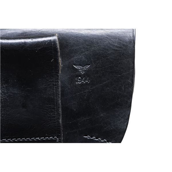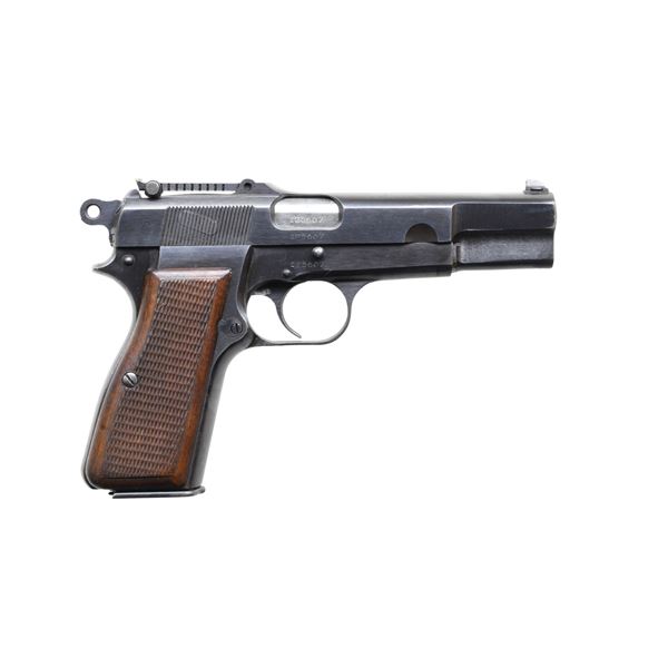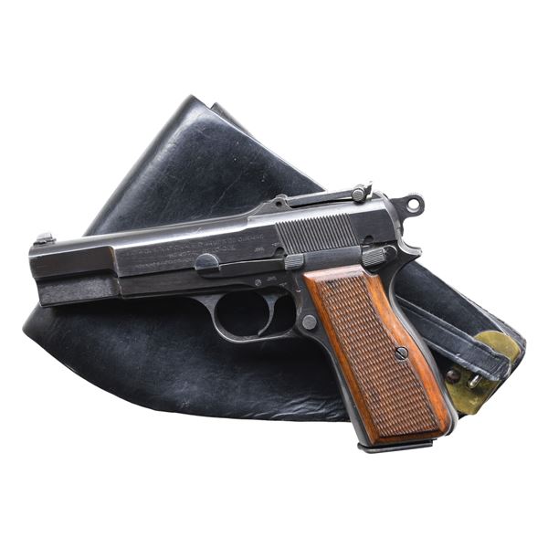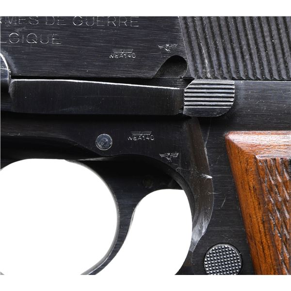 PISTOL WITH TANGENT REAR SIGHT & POST-WAR HOLSTER. Cal. 9mm Luger. S# 125607. Bbl. 4 5/8". High Power semi-automatic pistol mfg. in Belgium by FN while under German occupation, circa. January to November of 1942. The left side of the slide is marked "FABRIQUE NATIONALE D'ARMES DE GUERRE/ HERSTAL BELGIQUE/ BROWNING'S PATENT DEPOSE". Left side of the frame and slide exhibit an Eagle/WaA140 and eagle firing proof, with the frame also exhibiting an "MR" that is stamped on the forward trigger guard web. Metal components exhibit a blue finish overall, save for on the bbl., which is polished in-the-white. Frame is mounted with 2-piece checkered wood grips, which feature red anti-moisture paint on the interior of the panels. Dovetailed blade front sight, with tangent rear sight graduated 50-500. All serialized parts are matching and include the frame, slide, and bbl. MAGS: 2 13-rd. 1 mag. is blued and unproofed, with the other being parkerized and stamped with an indiscernible Eagle/WaA proof. UNATTACHED ACCESSORIES: black leather Post-War holster, with steel rivets. Rear of holster is spuriously marked with a Luftwaffe eagle over "1944". CONDITION: very good, with metal components retaining the majority of their original arsenal blue finish, exhibiting some areas of light to mild wear and thinning that show through to gray and brown patinas, as well as some scattered spots of light to mild surface oxidation. Grip straps exhibit consistent light to mild surface oxidation. Bright bore, exhibiting consistent mild pitting, while retaining well defined rifling throughout. Grips are very good, showing some light smoothing, as well as some scattered superficial marks from handling and storage. Holster remains malleable, exhibiting some wear and marks from handling and storage. (24-6912/MLW). CURIO. $1,200-1,800.