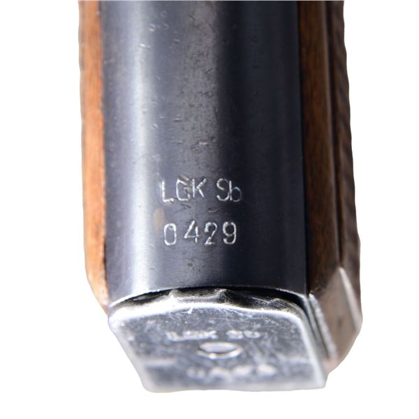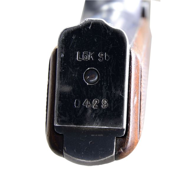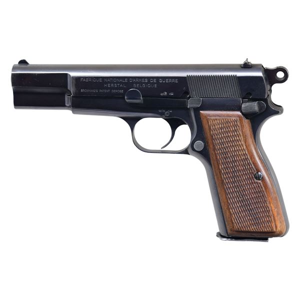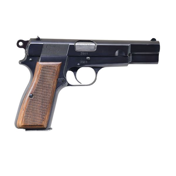 HIGH POWER PISTOL, TWO MATCHING MAGAZINES. Cal. 9mmP (9mm Luger). S# 3981. In 1955, the Austrian police placed an order for 10,000 High Power pistols. All were marked LGK (Landsgendarmeriekommando) followed by a 1-2 letter abbreviation for the state in which the pistol was assigned along with an issue number. This example is figured on page 200 (Fig. 200-3) of "The Belgium Browning Pistols" by Anthony Vanderlinden, featuring pictures of the matching mags., crediting Charles Wagner. This is a classic pistol with a rust blued finish, fixed sights, thumbprint slide, internal extractor, and round hammer. The left side of the slide has the customary three-line address and the usual Belgian proofs are on the left side of the slide, frame, and exposed barrel hood that is also marked with "CAL 9mmP". The full serial number is on the right side of the slide and frame with the matching number on the inner surface of the barrel hood. The frontstrap is marked "LGK SB/0429" reflecting "Salzburg Land" police, issue #0429. Fitted with wood checkered/bordered grips and a pair of postwar magazines, each with an aluminum follower, blued body, and black painted button-retained floorplate marked with the same police reference. CONDITION: near excellent with sharp edge wear from being holstered with a few light handling marks on the straps, mainly on the frontstrap, as consistent with a lightly carried pistol. Comparable condition grips and magazines. Mirror bore. Correct manual mechanics. A high condition, documented, and all matching Austrian police FN High Power pistol with two matching magazines from one of the smaller Austrian states. PROVENANCE: the Estate Collection of Charles Wagner. (25-1623/LA). CURIO. $2,000-3,000.