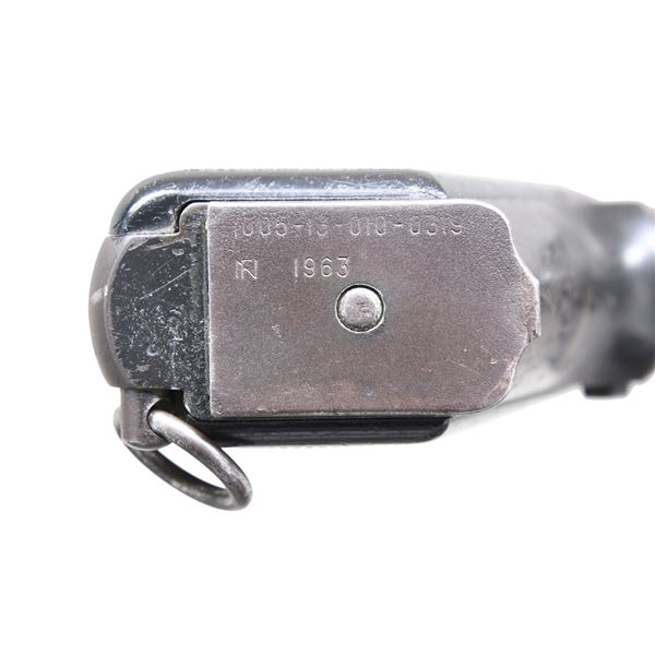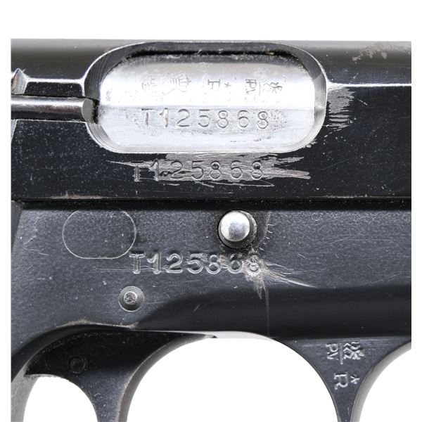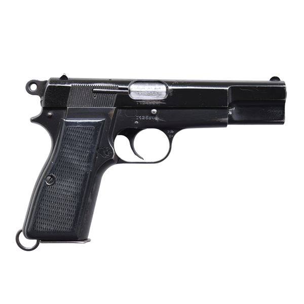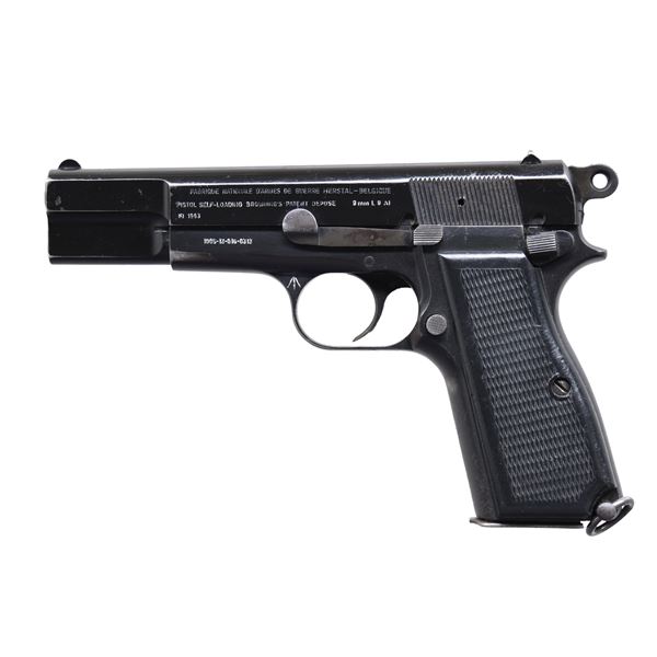 Cal. 9mm L9A1. S# T125868. This very seldom seen L9A1 military pistol with black enamel finish was made for Australia as reflected by the specifically added "PISTOL SELF LOADING" prefix to the slide address. It is otherwise very similar to the later form of British L9A1 pistols with the NATO stock number "1005-13-010-0313" on most major parts and the "9mm L9A1" reference added to the slide address. The pistol is a fixed sight High Power made in 1963 with a later form slide and external extractor. The left side of the slide is marked with the usual two-line FN address to which has been added the previously referenced markings. Broad arrow proof on the left side of the trigger guard. The right side of the gun has limited Belgian proofs and stacked, matching serial numbers on the barrel, slide and frame. Black plastic grips, the left panel recessed for a lanyard ring, and correct magazine with aluminum follower, phosphate body, and button-retained floorplate marked with the NATO stock numbers and the year 1963. No import marks. An identically marked pistol, just a few SNs away, is pictured in the Vanderlinden book, "FN Browning Pistols", 3rd Edition, Vol II, pages, 784, 785. MAGS: 1 proper 13-rd. mag., marked NATO # "1005-13-010-0319" above an intertwined "FN" monogram, and "1963" on the floorplate. CONDITION: about very good black enameled finish with holster wear. Front/backstrap thinning/freckling as one would expect from a military pistol that has seen moderate use. Comparable condition grips and magazine. Bright bore with sharp rifling. Perfect manual mechanics. A seldom seen military pistol by any metric! PROVENANCE: the Estate Collection of Charles Wagner. (25-1627/LA). CURIO. $2,500-4,500.