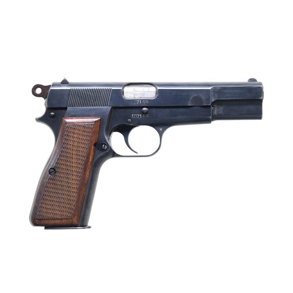 NATIONALE HIGH POWER SEMI-AUTOMATIC PISTOL. Cal. 9mm Luger. S# E07166. Bbl. 4 5/8". High Power semi-automatic pistol mfg. by Fabrique Nationale for the British military during the early 1950s. Available information is conflicting, with the "E" series High Powers being utilized for a number of contracts, but it is believed that the early "E" series pistols, were shipped to Great Britain. The left side of the slide is marked "FABRIQUE NATIONALE D'ARMES DE GUERRE/ HERSTAL BELGIQUE/ BROWNING'S PATENT DEPOSE", with Belgian commercial proofs marked on the left side of the frame and slide, as well as on the right side of the bbl. Metal components exhibit a blue finish overall, save for on the bbl., which is polished in-the-white. Frame is mounted with 2-piece checkered wood grips, which feature red anti-moisture barrier paint on the interior of the panels. Thumbprint slide, with a fixed half-moon blade front sight and dovetailed V-notch rear sight. All serialized parts are matching and include the frame, slide, and bbl. MAGS: 2 matching 13-rd. mags. CONDITION: excellent, with metal components retaining the vast majority of their original factory blue finish, exhibiting some spots/areas of light to mild wear and thinning, some superficial handling marks, as well as spots of mild pitting on the grip straps. Brilliant mirror bore, exhibiting areas of hardened grease, while retaining well defined rifling throughout. Grips show some light smoothing, as well as a few minor superficial marks from handling and storage, but are otherwise very good overall. PROVENANCE: the Estate Collection of Charles Wagner. (25-258/MLW). CURIO. $1,500-2,000.