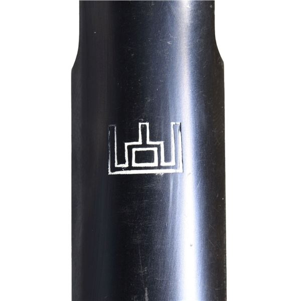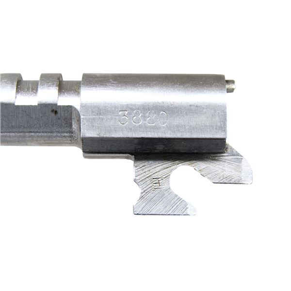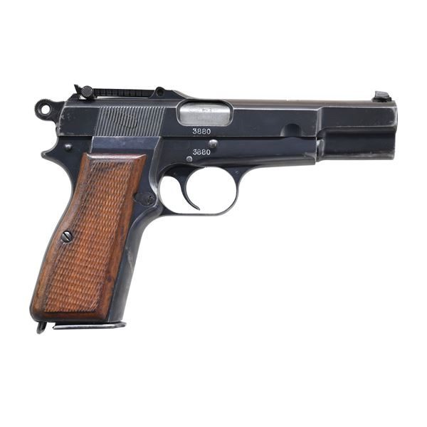HIGH POWER SEMI-AUTOMATIC PISTOL. Cal. 9mm Para. S# 3880. Bbl. 4 5/8". High Power semi-automatic pistol mfg. in Belgium by Fabrique Nationale under contract for Lithuania. The left side of the slide is marked "FABRIQUE NATIONALE D'ARMES DE GUERRE/ HERSTAL BELGIQUE/ BROWNING'S PATENT DEPOSE". Left side of the frame and slide, as well as the right side of the bbl. are marked with Belgian commercial proofs. Top of the slide is engraved with the Pillars of Gediminas crest. Left side of the frame (beneath the grip panel, top of slide (beneath the tangent rear sight), and left side of the bbl. lug are stamped with a small Pillars of Gediminas proof. Metal components exhibit a blue finish overall, save for on the bbl., which is polished in-the-white. Frame is mounted with 2-piece checkered wood grips. Dovetailed blade front sight, with tangent rear sight graduated 50-500. Slotted frame with distinctive staple lanyard loop on butt. All serialized parts are matching and include the frame, slide, and bbl. MAGS: 2 13-rd. 1 mag. is blued with an Eagle/WaA140 proof on the spine, with the other exhibiting a parkerized finish and being unproofed. UNATTACHED ACCESSORIES: reproduction black leather holster. CONDITION: very good, with metal components retaining the majority of their original factory blue finish, exhibiting some areas of mild wear and thinning that show through to gray patina, as well as some scattered superficial handling marks overall. Edges of the slide exhibit some small concentrated spots of light to mild pitting. Very bright bore, exhibiting consistent light pitting, while retaining well defined rifling throughout. Action functions appropriately when cycled by hand. Grips are very good overall, exhibiting a few superficial marks from handling and storage. Reproduction holster is very good overall. A nice example of a scarce Lithuanian contract High Power pistol. (24-6896/MLW). CURIO. $2,000-4,000.