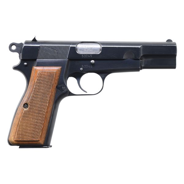 NATIONALE HIGH POWER SEMI-AUTOMATIC PISTOL WITH HOLSTER. Cal. 9mm Luger. S# 53245. Bbl. 4 5/8". High Power semi-automatic pistol mfg. by Fabrique Nationale, likely for the West German police in the early 1950s. The left side of the slide is marked "FABRIQUE NATIONALE D'ARMES DE GUERRE/ HERSTAL BELGIQUE/ BROWNING'S PATENT DEPOSE". Left side of the frame, slide, and right side of the bbl. exhibit Belgian commercial proofs. Metal components exhibit a blue finish overall, save for on the bbl., which is polished in-the-white. Frame is mounted with 2-piece checkered wood grips, which feature red anti-moisture barrier paint on the interior of the panels. Thumbprint slide, with fixed half-moon blade front sight. Rear sight has been modified via the milling of the center area of the original V-notch rear sight, and the addition of a higher square notch rear sight. All serialized parts are matching and include the frame, slide, and bbl. MAGS: 2 13-rd. 1 is matching via an electro-penciled "53245" on the spine, with the front face of the mag. body having been slightly ground down near the feed lips at one point in time. UNATTACHED ACCESSORIES: post-war German black leather holster, marked "A .KIND/ HUNSTIG" beneath the closure flap strap. Interior of closure flap exhibits a handwritten handwritten "Beier g Pol. Rer.". CONDITION: very good, with metal components retaining the vast majority of their original factory blue finish, exhibiting some light to mild edge wear, a couple of spots of light to mild wear and thinning, some superficial handling marks, as well as a couple of spots of light to mild surface oxidation. Bore is bright, exhibiting consistent light to mild pitting, while retaining strong rifling throughout. Grips are very good overall, save for a small crack that is present at the top of the right panel. Holster remains malleable, exhibiting wear, scattered marks from handling and storage, as well as some spots of light age related cracking and crazing, but otherwise remains sturdy ands serviceable. PROVENANCE: the Estate Collection of Charles Wagner. (25-283/MLW). CURIO. $1,200-1,800.