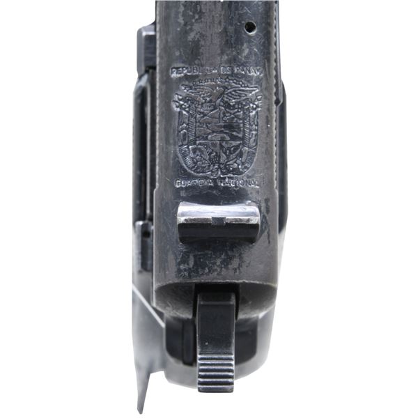 NATIONALE HIGH POWER SEMI-AUTOMATIC PISTOL. Cal. 9mm Luger. S# 245PY65162. Bbl. 4 5/8". High Power semi-automatic pistol mfg. in Belgium by Fabrique Nationale under contract for the National Guard of Panama in 1982. The left side of the slide is marked "FABRIQUE NATIONALE HERSTAL BELGIQUE/ BROWNING'S PATENT DEPOSE". Top of the slide is marked "REPUBLICA DE PANAMA/ (PANAMANIAN COAT OF ARMS)/ GUARDIA NACIONAL", just ahead of the rear sight. Right side of the frame is marked with Belgian commercial proofs on the forward trigger guard web. Metal components exhibit a black enamel type finish, which was applied over a parkerized finish. Frame is mounted with 2-piece checkered black synthetic grips. Left side of the frame is mounted with a lanyard ring. Fixed half-moon blade front sight, with dovetailed square notch rear sight. All numbers are matching via "1162" and are present on the frame, slide, and bbl. in the "stacked" fashion. Slide stop lever is a blued replacement. MAGS: 1 13-rd. mag., with smooth parkerized body and blued button floorplate. CONDITION: metal components retain large amounts of their black enamel finish, exhibiting areas of flaking, wear, and handling marks overall that show through to parkerizing, with areas of edge wear that show through to gray patina. Very bright bore, exhibiting light to mild pitting, while retaining strong rifling throughout. Grips show mild smoothing, as well as scattered marks and impressions from handling and storage, but otherwise remain sturdy and serviceable. PROVENANCE: the Estate Collection of Charles Wagner. (25-275/MLW). MODERN. $800-1,200.