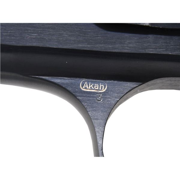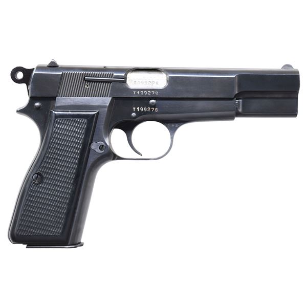 NATIONALE HIGH POWER SEMI-AUTOMATIC PISTOL. Cal. 9mm Luger. S# T199278. Bbl. 4 5/8". High Power semi-automatic pistol mfg. by Fabrique Nationale. The left side of the slide is marked "FABRIQUE NATIONALE D'ARMES DE GUERRE HERSTAL-BELGIQUE/ BROWNING'S PATENT DEPOSE". Left side of the forward trigger guard web is marked "Akah" within an oval (Albert Kind, German importer of FN firearms into the Federal Republic of Germany). Right side of the forward trigger guard web is marked with Belgian commercial proofs, which are also present on the right side of the bbl. Metal components exhibit a high polish blue finish overall, save for on the bbl., which is polished in-the-white. Frame is mounted with 2-piece checkered black synthetic grips. Slide features an external extractor, with a fixed half-moon blade front sight and dovetailed V-notch rear sight. All serialized parts are matching via the full S#, which is present in the "stacked" fashion on the right side of the frame slide, and bbl. MAGS: 1 13-rd. UNATTACHED ACCESSORIES: a page of notes from Charles Wagner, indicating the history of this variation, as well as that very few High Power pistols are seen with the "Akah" marking. CONDITION: exceptional, with metal components retaining bountiful amounts of their original factory blue finish overall, exhibiting a few superficial marks from handling and storage overall, as well as a few pinprick spots of light surface oxidation on the grip straps. Brilliant mirror bore, retaining sharp and well defined rifling throughout. Grips show a few superficial marks from handling and storage, but otherwise remain sturdy and serviceable. An exceptional example of an "Akah" marked High Power, that one would find extremely difficult to upgrade from. PROVENANCE: the Estate Collection of Charles Wagner. (25-284/MLW). CURIO. $1,750-2,250.