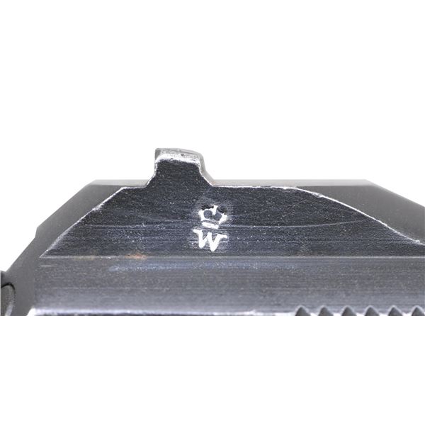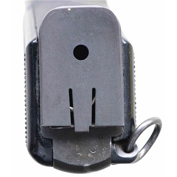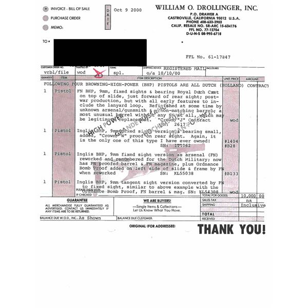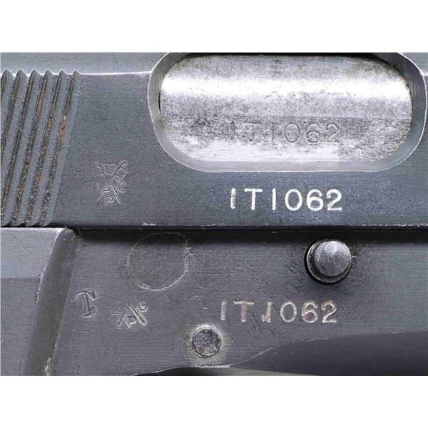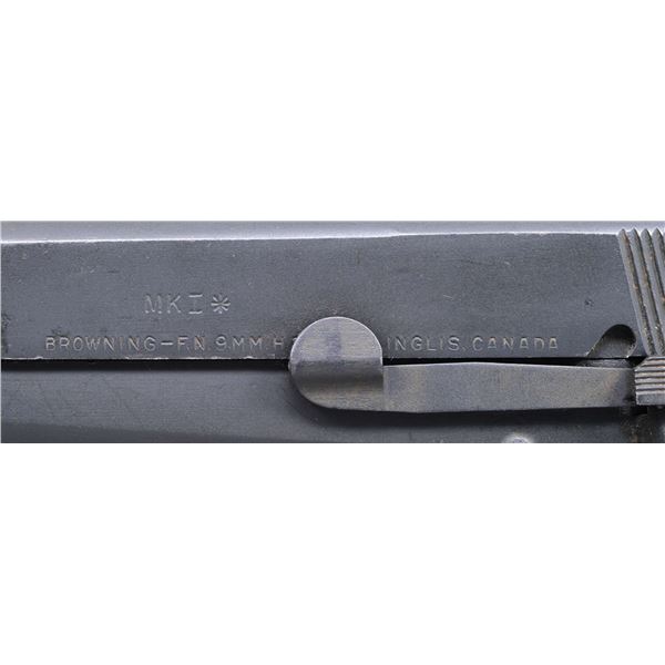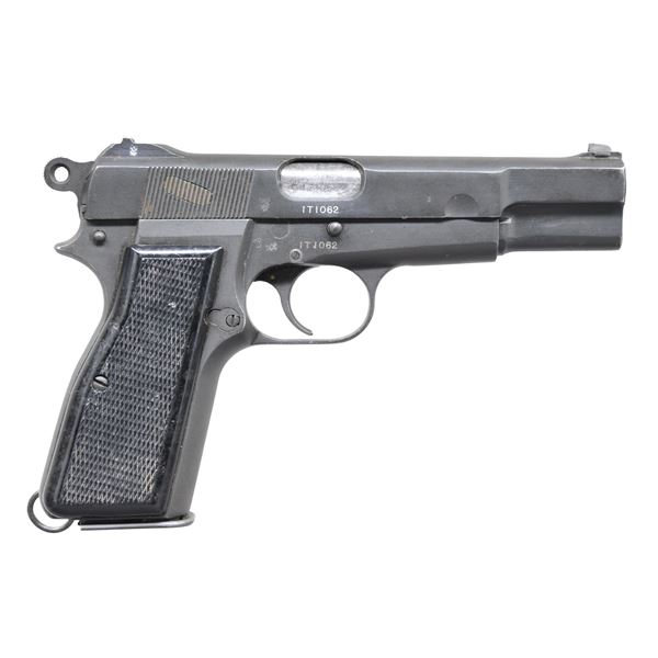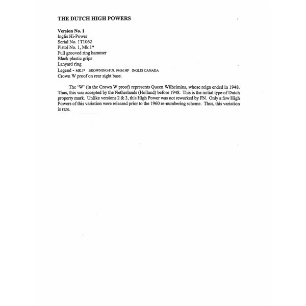 INGLIS NO.2 MK.I* HIGH POWER SEMI-AUTOMATIC PISTOL. Cal. 9mm Luger. S# 1T1062. Bbl. 4 5/8". Early No.2 MK.I* semi-automatic pistol mfg. by Inglis under contract for the Netherlands prior to 1948, with this example being one of very few Inglis High Power pistols released by the Netherlands prior to the 1960 Dutch renumbering scheme. The left side of the slide is marked "MK I*" above "BROWNING-F.N.9mm.H.P.", followed by "INGLIS, CANADA", with Canadian proofs marked on the right side of the frame and slide. Right side of the rear sight base is marked with a Dutch Crown/W for Queen Wilhelmina. Metal components exhibit a period arsenal applied parkerized finish overall, save for on the bbl., which is polished in-the-white. Frame is mounted with 2-piece checkered black synthetic grips. Thumbprint slide features a small dovetailed blade front sight, with a fixed square notch rear sight. Left side of the frame is fitted with a lanyard ring. All serialized parts are matching and include the frame, slide, and bbl. MAGS: 1 phosphate 13-rd., with "JI" stamped on the body and split tail floorplate. UNATTACHED ACCESSORIES: a page of notes regarding this variation from Charles Wagner, as well as an invoice from William O. Drollinger (William O. Drollinger is described as a noted American High Power Collector in Blake Stevens' book, "The Browning High Power Automatic PIstol") dated October 9th of 2000, listing this pistol by S#. CONDITION: metal components retain the vast majority of their period arsenal parkerized finish, exhibiting some mild wear and thinning (primarily on the forward edges of the slide), some light edge wear, some light superficial handling marks, as well as some scattered spots of light pitting beneath the finish. Near mirror bore, exhibiting some light to mild pitting towards the muzzle, while retaining well defined rifling throughout. Grips show some superficial marks from handling and storage, but otherwise remain sturdy and serviceable. An exceedingly scarce first variation Dutch contract Inglis No. 2 Mk. I* High Power pistol. PROVENANCE: the Estate Collection of Charles Wagner. (25-267/MLW). CURIO. $2,000-2,500.
