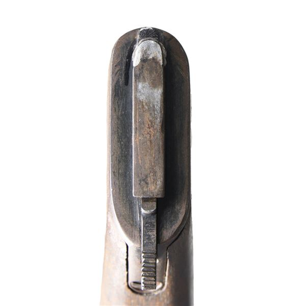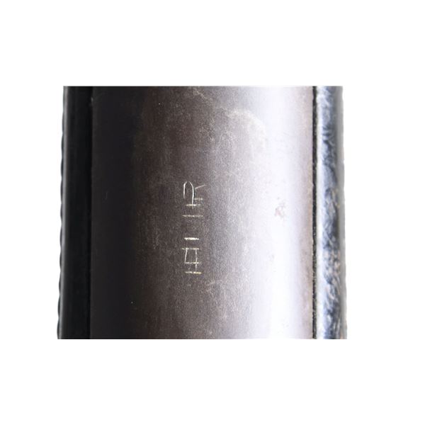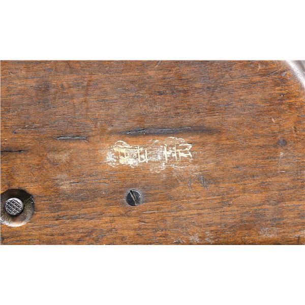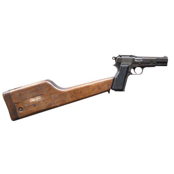 SEMI-AUTOMATIC PISTOL WITH CHINESE MARKED STOCK HOLSTER. Cal. 9x19mm. S# 4CH9708. Bbl. 4 5/8". MK. I* High Power semi-automatic pistol mfg. in Canada by Inglis under contract for the Nationalist Chinese military. The left side of the slide is marked "MK. I*" above "BROWNING FN 9MM HP" and "INGLIS CANADA". Right side of the frame and slide exhibit Canadian proofing. Front grip strap is marked with several Chinese characters (likely indicating Communist reissue). Metal components exhibit a parkerized finish overall, save for on the bbl., which is polished in-the-white. Frame is mounted with 2-piece checkered black synthetic grips. Dovetailed blade front sight, with V-notch tangent rear sight, graduated 50-500. Rear of frame is slotted for a stock attachment, with the left side exhibiting a provision for a lanyard ring. All serialized parts are matching and include the frame, slide, and bbl. MAGS: 1 phosphate 8-rd. marked "JI" on the mag. body and on the split tail floorplate. UNATTACHED ACCESSORIES: wood shoulder stock marked with Chinese characters on one side. Stock iron has been repaired at one time. CONDITION: metal components retain large amounts of their arsenal parkerized finish, exhibiting some areas of wear and thinning that show through to gray patina and silvering, with varying degrees of oxidation and pitting present overall (as to be expected from Chinese issued small arms). Bore is bright, exhibiting consistent mild oxidation and pitting, while retaining strong rifling throughout. Grips show smoothing and numerous superficial marks from handling and storage. Stock shows scattered marks and impressions from handling and storage, with some minor chipping present on the body around the edges near the lid. Stock iron exhibits an aforementioned repair. A rare example of a Chinese marked Inglis Mk. I* pistol and stock. (25-1433/MLW). CURIO. $1,200-2,000.