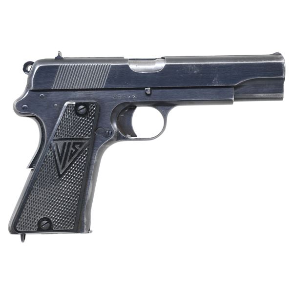 SEMI-AUTOMATIC PISTOL. Cal. 9mm Luger. S# C1277. Bbl. 4 5/8". Vis.35 (also known as the "wz.35" or "P.35(p)") semi-automatic pistol mfg. in Poland at the Radom arsenal while under German occupation during World War II. The left side of the slide is marked "F.B.RADOM VIS Mod.35.Pat.Nr.15567.", followed by an eagle firing proof and Steyr Eagle/623 proof (indicating final assembly at Steyr), above a Radom WaA77 proof, and the German designation "P.35(p)". Left side of the frame is marked with a Radom Eagle/WaA77 proof, with Steyr Eagle/623 proofs marked on the bbl. Metal components exhibit a blue finish overall, save for on the bbl., which is polished in-the-white. Frame is mounted with 2-piece checkered black synthetic grips, with "FB" on the left panel and "VIS" on the right. Slide features a matte rib, with a fixed blade front sight and dovetailed V-notch rear sight. Frame is slotted for a stock attachment. All serialized parts are matching and include the frame, slide (interior), and bbl. (left side of lug). MAGS: 1 blued 8-rd. CONDITION: very good, with metal components retaining the majority of their original arsenal blue finish, exhibiting some areas of light to mild wear and thinning, some light edge wear, some superficial handling marks, as well as some scattered spots of light surface oxidation. Brilliant mirror bore, exhibiting some scattered pin prick spots of light pitting, while retaining well defined rifling throughout. Grips show some smoothing, as well as a few superficial marks from handling and storage, but otherwise remain sturdy and serviceable. PROVENANCE: the Estate Collection of Charles Wagner. (25-320/MLW). CURIO. $1,000-2,000.