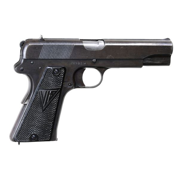 SEMI-AUTOMATIC PISTOL WITH HOLSTER. Cal. 9mm Luger. S# R4321. Bbl. 4 5/8". wz.35 (German designation: "P.35(p)") semi-automatic pistol mfg. in Poland at the Radom arsenal while under German occupation. Left side of the slide is marked "F.B.RADOM VIS Mod.35.Pat.Nr.15567." above a Radom Eagle/77 proof, a German eagle firing proof, as well as a Steyr Eagle/623 proof (indicating final assembly at Steyr). Sides of frame exhibit a Radom Eagle/77 proof, with the bbl. exhibiting a Steyr Eagle/623 proof. Metal components exhibit a blue finish overall, save for on the bbl., which is polished in-the-white. Frame is mounted with 2-piece checkered black synthetic grips, with "FB" on the left panel and "VIS" on the right. Slide features a matte rib, with a fixed blade front sight and dovetailed V-notch rear sight. All serialized parts are matching and include the frame, slide, and bbl. MAGS: 2 blued 8-rd. UNATTACHED ACCESSORIES: unmarked reproduction black leather holster. CONDITION: good, with metal components retaining the majority of their original arsenal blue finish, exhibiting some areas of light to mild wear and thinning, as well as scattered spots of light to mild surface oxidation overall. Bright bore, exhibiting consistent light to mild pitting, while retaining well defined rifling throughout. Grips are good, showing some smoothing, as well as some superficial marks from handling and storage. Holster is very good overall. (24-6864/MLW). CURIO. $1,000-1,500.