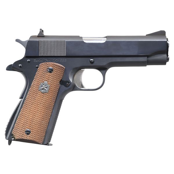AUTO PISTOL LINKED TO US ARMY BRIGADIER GENERAL CHARLES WEST, JR. Cal. 45 ACP. S# GO 223. On Page 114 of "U.S. GENERAL OFFICER PISTOLS: A COLLECTOR'S GUIDE" by Ken WIlliams & Dr. John W. Brunner, S# GO 223 is linked to Charles West, Jr. Charles West Jr., per information from the Citadel Alumni Association, entered The Citadel college in 1939 and won the star of West Medal. He served on active duty in the US army in the Pacific Theater from May 1943 to Sept. 1946. As a captain, he was an aide-de-cap to General of the Army, Douglas MacArthur. During the Korean War, he was recalled to active duty and again in 1957. During the Vietnam War, he served as a lieutenant colonel in the Office of the Deputy Chief of Staff for Operations in the Pentagon specializing in special operations, which required temporary tours of duty in South Vietnam. Colonel West was release from active duty in late 1970 and worked as a management consultant. He was promoted to Brigadier General in 1973 and continued to serve on short tours of duty with the Army Staff until his retirement from the US Army Reserve in 1978. General West was awarded the Legion of Merit, The Bronze Star Medal, Joint Service and Army Commendation Medals, The Combat Infantryman Badge, Parachutist Badge, Army General Staff Badge, the French Croix de Guerre, Philippine Legion of Honor and the Vietnam Cross of Honor. The M15 was developed by Rock Island Arsenal as the only pistol ever developed and manufactured solely for issue to US Army General Officers as replacement for Colt Model 1903 & 1908 pocket pistols. Total of 1,004 were produced beginning in 1972. This pistol is based on the Colt Commander with 4 1/2" barrel. 1911A1 profile having chrome National match style trigger, National Match sights & checkered front strap. Two piece checkered walnut grips with blank plaque on left panel & Rock Island Arsenal emblem on right panel. MAGS: 1 - 7 rd. CONDITION: near excellent original blue finish with scattered pinprick patina & light cycling wear. Near excellent grips. Very good bore with strong rifling & light frosting. (25-1584/MD). CURIO. $7,500-10,000.
