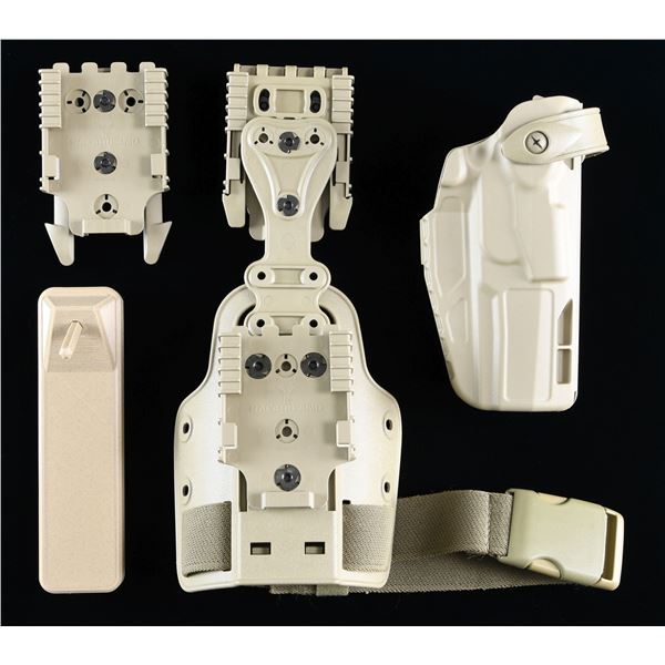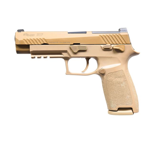 Cal. 9x19. S# TF002965. Bbl. 4 3/4". Three dot night sights. Slide has cut for RMR plate for red dot mounting. Scarce US Army issued Sig M17 pistol with cage code on left side of slide. Ambi Safety. Coyote Tan PVD-finish. Polymer frame with accessory rail. MAGS: 1-17 rd. & 2-21 rd. Total of 3. UNATTACHED ACCESSORIES: matching numbered factory box with manual, Certificate of Authenticity, trigger lock, spare recoil spring & Safariland Shoulder holster rig. CONDITION: metal & polymer show expected scuffing, edge & operational wear consistent with military usage. Action functions properly when hand cycled. Near excellent bore with strong rifling. (25-1145/MJC). MODERN. $2500-3500.