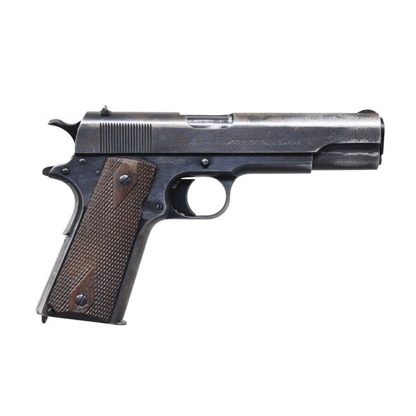 This pistol has the correct era "Black Army" finish, which is the collector term for the wartime finish of Colt 1911 pistols with a less polished blue. This pistol was manufactured within a large S# block 290,000-450,000 for war time pistols. Appears to have all correct era parts including Colt 5" Type 4 barrel. Type A front & Type B rear sights. Type A slide lock. Type C hammer. Long trigger. Short grip safety. Type 1 mainspring housing & Type 2 pin. Type C magazine lock. Colt Type 1 double diamond walnut grips. Left side of frame has "S14" eagle's head proof. MAGS: 1 correct era replacement two tone 7 rd. magazine. UNATTACHED ACCESSORIES: 1911 Holster as stated above. Holster fair, but intact condition showing wear to finish, cracking of finish & verdigris around brass parts. CONDITION: fine. Over 75% original blue finish. Slide has large areas of finish turned gray/brown patina from holster wear or blood pitting; pattern of finish loss commensurate with surface area of palm & fingers on hand to rack the slide. Frame shows more fuller finish with fading to gray on front strap, bow of triggerguard, palm contact areas of grip safety & bottom of mainspring housing. Barrel has very good finish with light cycling wear; good bore shows strong rifling, residue & light pitting in grooves. (25-1489/MD). CURIO. $3,000-5,000.