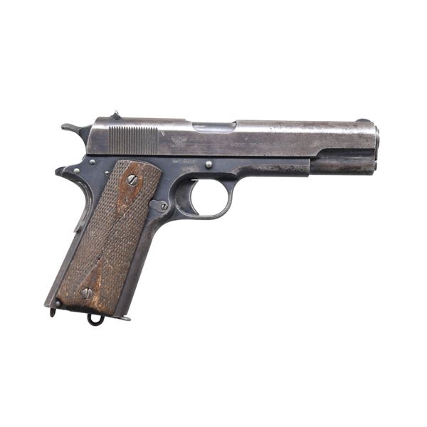 PISTOL. Cal. 45 ACP. S# 116914. Mfg. 1915 within S# range 113497-120566. Appears to have most correct parts: Type 11 barrel with "P" on left side leg, but "S" applied on top of breech end. Springfield Armory "S" proof on barrel, slide stop, safety lock, grip safety, mainspring housing, mag. catch, extractor, firing pin stop, sear & barrel bushing; not visible on disconnector, hammer or trigger. Appears to have correct era parts including double diamond checkering walnut grips. MAGS: 1 Springfield Armory 7 rd. w/ brass tap on spine & lanyard loop. CONDITION: Slide has traces of blue with balance having a gray/brown patina appearance with scratches, marks & cleaned pitting. Frame has fair blue with carry & contract areas fading to gray/brown patina with peppery oxidation & marks. Left grip panel has large gouge/contouring for thumb around top grip screw, which shows heavy distortion. Poor right grip shows repaired vertical crack with worn checkering. Barrel shows faded original blue with cycling wear; poor bore shows worn rifling & pitting. (24-7164/MD). CURIO. $1,200-1,800.