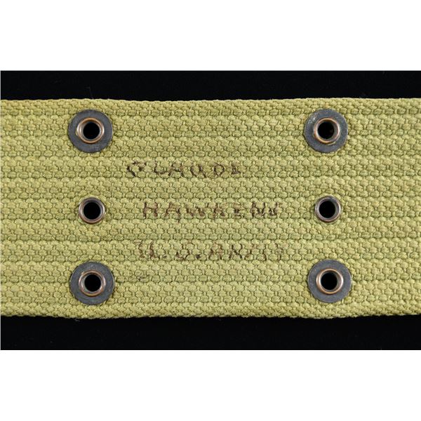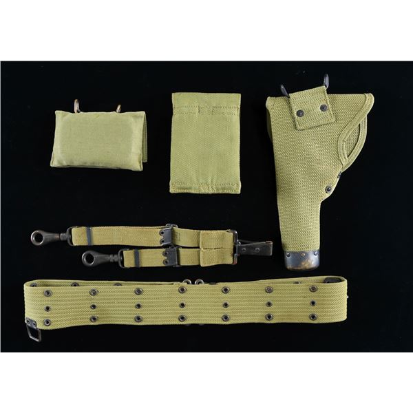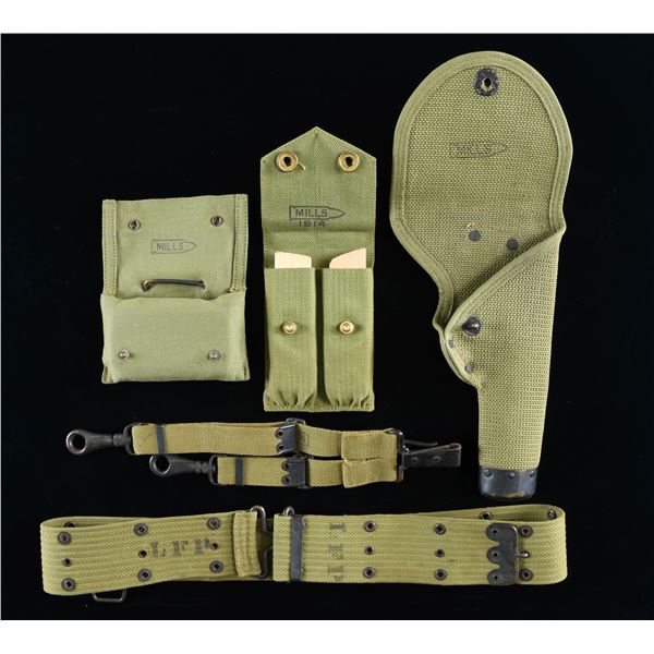 ACCOUTREMENTS. This desirable set is all of Mills manufacture. A similar set is pictured on page 778 of the book, U.S. MILITARY HOLSTERS AND RELATED ACCOUTREMENTS by Edward Scott Meadows. The web holster is equipped with Model 1910 belt hook. The flap is marked on the inside with the Mills cartridge logo. The metal tip is marked at the bottom with both the Mills logo and 1914 patent dates. Holster is equipped inside with felt pad. Flap is fastened w/ "lift the dot" type fastener. The Model 1912 pistol belt is marked on the end tab "MADE BY" / "MILLS WOVEN CARTRIDGE BELT CO." / "WOCESTER MASS U.S.A.". Belt is marked inside w/ stenciled "LFP" and inked w/ name "CLAUDE HAWKENS" / "US ?". Belt is equipped with a trapezoidal ring for the saber attachment. Two strap saber attachment which is marked "MILLS" on the long strap. Straps are equipped w/ locking swivels. Two pocket mag. pouch. Flap is secured by 2 rimless eagle snaps and is marked inside w/ Mills cartridge logo plus "1914". Cartridge pouch has belt loop w/out position snap. Mills first aid pouch marked inside w/ Mills cartridge logo. Flap is retained by 2 plain snaps. Pouch has wired belt hook. Pouch contains sealed U.S. Army first aid packet dated 1914. All items have Mills Bronze subdued brass fittings. CONDITION: most items are in very good serviceable condition w/ very light wear & a sm. degree of staining commensurate w/ age & careful use. Brass tip on holster has large crack. Metal trimmings have some finish loss but still retain a pleasing patina. PROVENANCE: The Collection of Edward Scott Meadows. (02-23132/RW). $800-1,200.