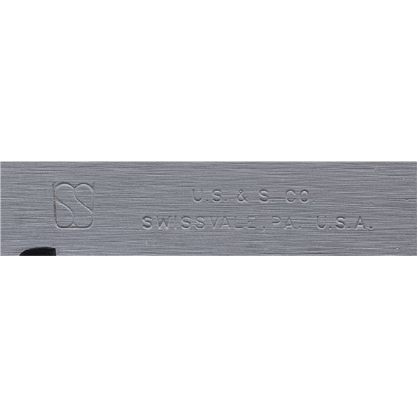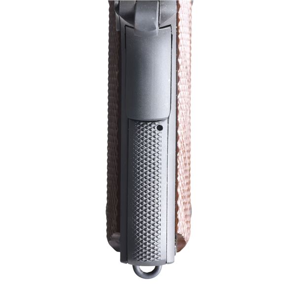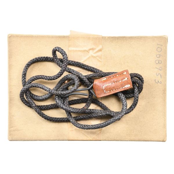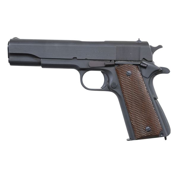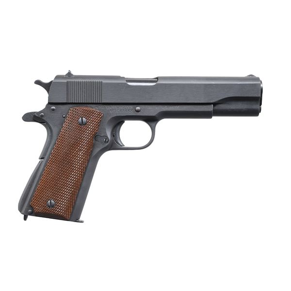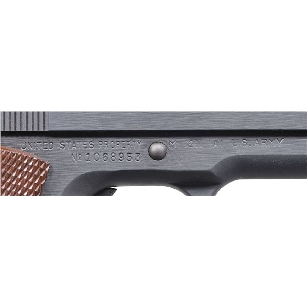 PISTOL. Cal. 45 ACP. S# 1068953. Mfg. 1943, approx. 55,000 mfg. in Swissvale, PA. Pistol appears to have all correct era parts including High Standard 5" barrel & Keyes Fiber brown plastic grips. MAGS: 1 - Scovill 7 rd. mag. UNATTACHED ACCESSORIES: Type 2 cord lanyard contained in Brown cardboard box with matching number on lid. CONDITION: pistol has near excellent arsenal style bead blasted refinish. Very good grips. Barrel has refinished blue with good bore showing wear to rifling & light pitting. (24-6859/MD). CURIO. $2,500-4,000.