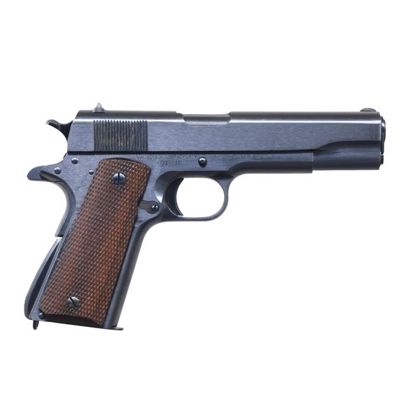 Cal. 45 ACP. S# 716810. Mfg. 1939 for the US Navy. Appears to have most correct era parts except replacement Post WWII Colt Type 6 Barrel. Slide has matching number on rear face. MAGS: 1 reblued Commericial 7 rd. mag. CONDITION: extremely fine as professionally restored. Over 97% restored brushed blued finish with slide showing cycling wear on left side. Near excellent grips. Bore shows strong rifling & light pitting throughout. (24-6794/MD). CURIO. $1,750-3,000.