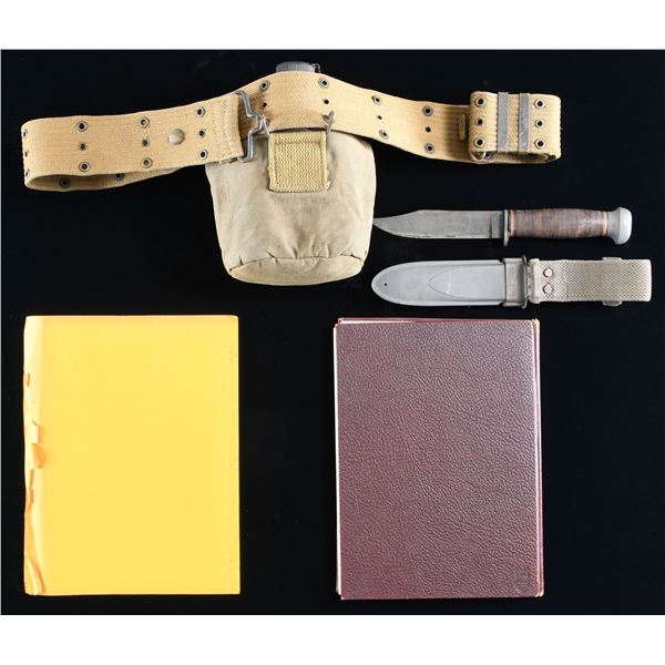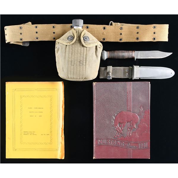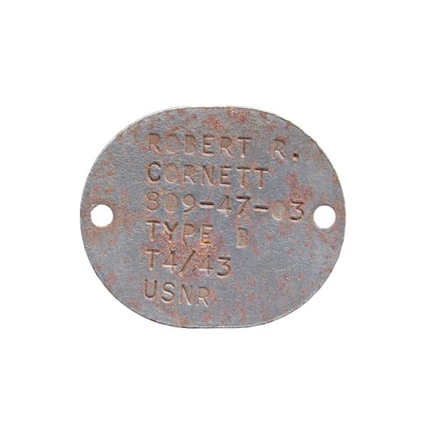 BELONGING TO ROBERT R. CORNETT OF THE US NAVY. Cal. 45 ACP. S# 870277. Pistol is of the 1943 configuration within S# range 857,000-1,609-529 having a Parkerized finish. It appears to have the correct parts, including a 5" blued Colt Type 6 bbl. and Type 7 Colt wood grips. MAGS: NONE. UNATTACHED ACCESSORIES: this fine pistol is accompanied by its original WWII brown leather holster with brass snap-on retention. The accessories further include Cornett's 1943 dog tag, his web belt with attached canteen and cover, his "U.S.N."-marked Mark 1 side knife by PAL with its original sheath, his 1940 yearbook from the Mustangs of Clifton High School, Clifton, NJ, and finally his birth certificate. CONDITION: good, original, Parkerized finish, showing over 80% coverage with cycling and edge wear, along with spots of pitting on the forward portions of the slide and frame. Frame has light wear and scratches in the takedown area on the left. Very good grips with a few chipped diamonds. Bbl. shows good blue with cycling wear; bore is good with strong rifling and light pitting around the muzzle. Holster is intact but shows heavy wear, with verdigris and an outline of a previous stud through the embossed "US" on the body. Belt, canteen, and knife show light overall wear. Dog tag has an oxidized finish. Yearbook is well used but still complete and reasonably solid. (24-6434/MD/BF). CURIO. $1,400-1,800.