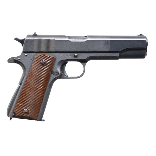 Cal. 45 ACP. S# 1016033. Originally mfg. 1943 within S# range 995,000-1,041,404. Appears to have all correct period parts including High Standard 5" barrel & Keyes Fiber brown plastic grips. MAGS: 1 reblued Ridson 7 rd. mag. UNATTACHED ACCESSORIES: Type 2 lanyard. CONDITION: slide & frame has very good arsenal style parkerized refinish with scratches, wear in slide lock area & wear to forward portions of slide & frame. Very good grips. Good original barrel blue with wear from cycling; shiny bore has strong rifling. (24-6837/MD). CURIO. $1,000-1,500.