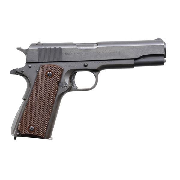 Cal. 45 ACP. S# 1620890. Post WWII Colt Commercial Government Model slide w/ 5" barrel having marks like Type 6. Colt 1944 military frame with most correct era parts (S# 1,609,529-1,743,846) including Coltwood grips; hammer is Type E replacement. Left side of frame has incorrect "GHD" proof. MAGS: 3 WWII 7 rd. ; 1 MS Little in good condition, 1 Ridson in very good condition, & 1 Scovill in fair, reblued pitted condition. CONDITION: pistol has very good arsenal style parkerized refinish. Slide & frame shows light wear & scratches throughout; carry wear & spots of patina on front strap. Hammer shows light pitting. Very good grips. Parkerized barrel has very good bore with pitting forward of chamber. (25-491/MD). CURIO. $1,200-1,800.