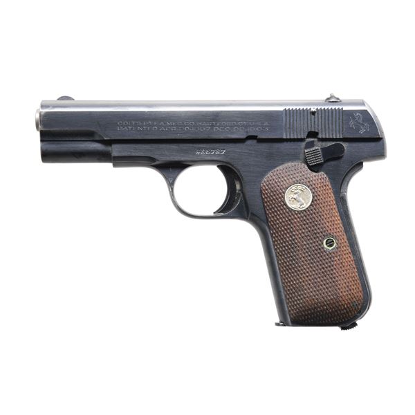 Cal. 32 ACP. S# 486787. Bbl. 3 3/4". Semi-circular front sight w/ U notch rear sight. Blue finish. 2 piece checkered walnut grips w/ rampant colt medallions. Mfg. 1928. CONDITION: over 95% original blue showing muzzle & edge wear w/ small spots of corrosion. Grips show some checkering wear. Very good bright bore. (24-6435/DS). CURIO. $900-1,100.