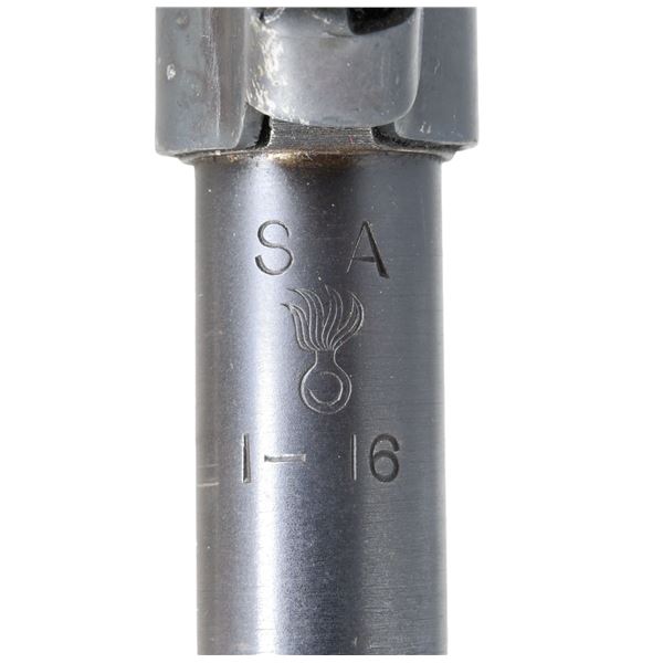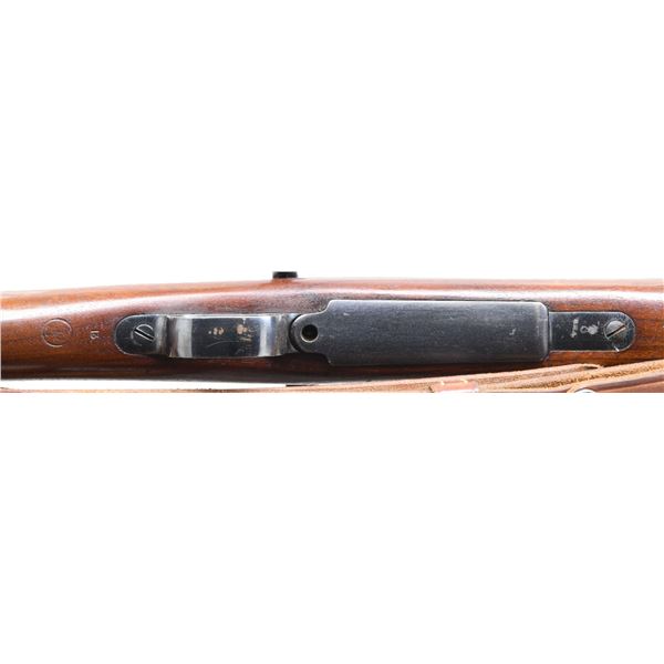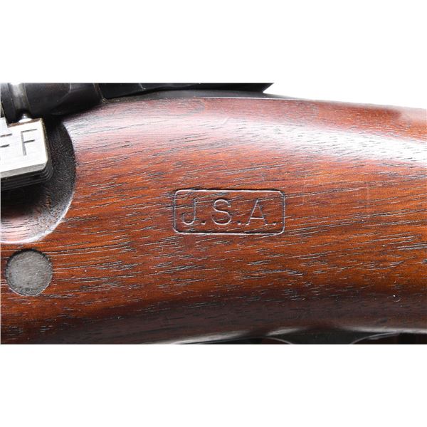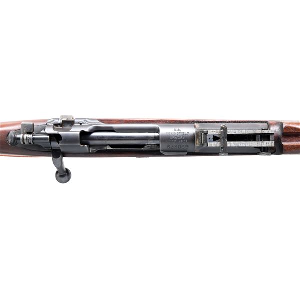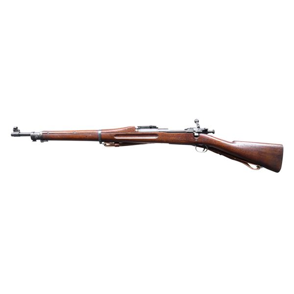 BOLT-ACTION MILITARY RIFLE. Cal. 30-06. S# 623069. Bbl. 24". Marked behind front sight "SA / flaming bomb / 1-16". This rifle, produced in 1916, has the NRA & flaming bomb markings on the forward end of the trigger guard. The NRA marking on the 1903 rifles was added to distinguish rifles sold to members of civilian rifle clubs so that these arms might be distinguished from possibly misappropriated government property. Ladder rear sight graduated to 2,850 yards w/ volley notch. Dished windage & elevation knobs. Sight face & windage scale have been polished bright. Blade front sight w/ blued steel issue type sight cover. Bolt w/ straight down handle has small gas escape hole. All milled furniture including fine checkered trap buttplate. Trigger guard & lower band have polished blue. Balance of metal has the standard arsenal blue. Grooved trigger. Underside of cut-off is polished bright. S type walnut stock & handguard. The stock w/ grasping grooves, has a crisp boxed JSA on the left over the trigger guard. It is also marked w/ an encircled script "P" proof under grip & a tiny "13" assembly no. Good quality military style tan leather sling. UNATTACHED ACCESSORIES: nickel plated oiler in butt. CONDITION: stock set has nice original finish w/ the scattered small handling marks, showing very careful use. Metal retains 85% of its blued finish w/ light wear. Notable area of wear on left side of upper band. Bore is shiny. Lands show the moderate wear expected from long careful use. (24-7100/RW). CURIO. $1,200-1,800.