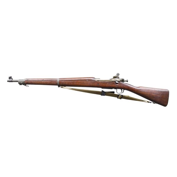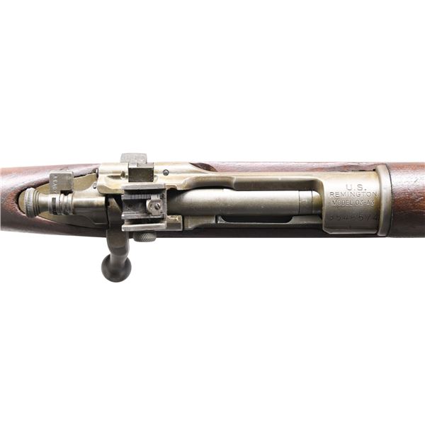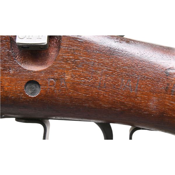 RIFLE. Cal. 30-06. S# 3546574. Bbl. 24". Bbl. is marked behind the front sight with "RA (flaming bomb) 3-43." Aperture rear sight graduated to 800 yds. Blade front sight with blued steel sight protector. All visible parts' markings are "R." Walnut stock set. Straight grip stock has two recoil bolts. Stock is marked on the left side with "RA (crossed cannons)," a boxed "FJA", an encircled "P" proof under the grip, and several assembly marks visible forward of the trigger guard. All stamped furniture, including checkered trap buttplate and large-bow Smith Corona trigger guard. Green web sling. UNATTACHED ACCESSORIES: plastic oiler in the butt. CONDITION: original finish stock set has light wear and scattered handling marks and a notable chip in the left rear of the handguard at the stock line. Metal retains a very large degree of its greenish-gray wartime parkerization. Very good, bright, shiny 4-groove bore. (24-5776/RW). CURIO. $600-800.