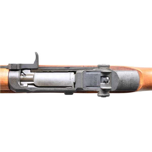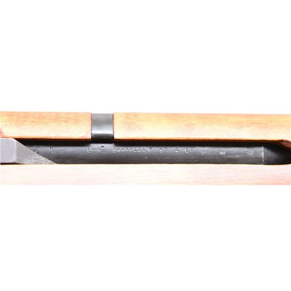 MILITARY RIFLE. Cal. 30-06. S# 4527807. Bbl.24" Throat gauges 4.0. Muzzle gauges 6.0. Barrel markings on the right side include "LMR 7 53". Rifle has correct " IHC" metal parts to include sight knobs and gas cylinder lock screw. T105E1 aperture rear sight. Blade front sight with protective ears. Birch replacement stock set with a very good appearance. The buttstock is marked only with a non-serif encircled "P" proof under grip. UNATTACHED ACCESSORIES: combination tool w/ brush in butt. CONDITION: stock set has an arsenal replacement finish showing only very light wear and tiny handling marks. Metal retains 95% of its arsenal rework dark parkerization. Bore has strong lands with oxidation and frosting. (25-1440/RW). CURIO. $1,400-1,900.