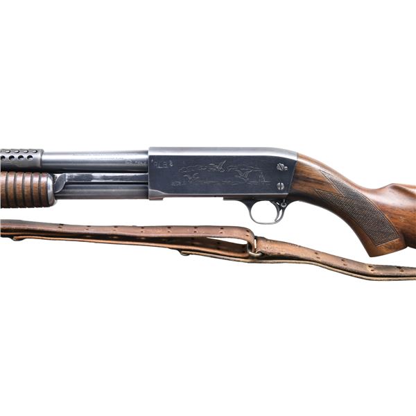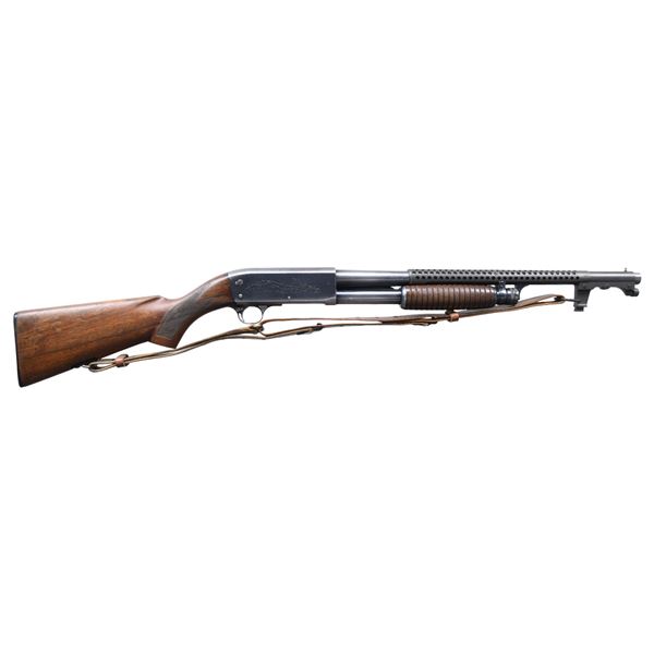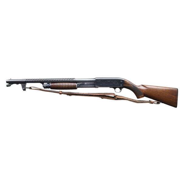 Cal. 12 ga. 2 3/4". S# 335493. Bbl. plain shortened to 20 1/2". Original choke marking was Full. Added 4 row handguard & bayonet lug. Right side of action has added "R.L.B." inspector's marks w/ added "P" firing proof & flaming bomb marking. Right side of receiver has added "U.S." marking. Small round grooved forearm & uncapped pistol grip checkered walnut stock w/ original buttplate. Toeline of stock is notched for addition of military style sling swivel. Leather military sling. Mfg. 1950. CONDITION: 70% thinning original blue. Stocks have worn finish showing scratches & marks. Bore is generally bright showing small spots of light pitting. (24-6620/DS). CURIO. $600-900.