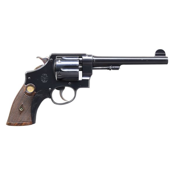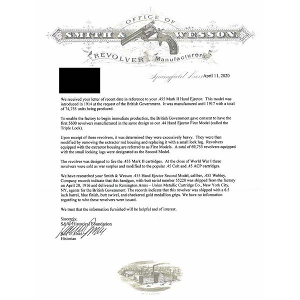 Cal. 455 Webley. S# 5220. Bbl. 6 1/2" pinned. Round blade front sight. Fixed rear sight. Matching numbers on grip frame, extractor, cyl., & right grip panel. British contract Mark II HE 2nd Model DA revolver. Revolver has various British military & sale markings including "X's". Blued finish with case colored trigger & hammer. Checkered walnut grips with diamond center & gold S&W medallions. S&W grip adapter present. Lanyard hole is vacant. UNATTACHED ACCESSORIES: factory letter that confirms the revolvers configuration. The letter further states the gun was shipped to Remington UMC in NYC in 1916, acting on behalf of the British government. CONDITION: grips show a few handling marks. Hammer & trigger retain most of their case colors with some operational wear & light oxidation. Balance of metal retains 90% original blue with some fading on grip straps, edge & operational wear. Action functions properly when hand cycled. Bright near excellent bore. PROVENANCE: From the Estate of Jon Thomas, Gunsport, LTD. (25-1088/MJC). CURIO. $1000-1500.