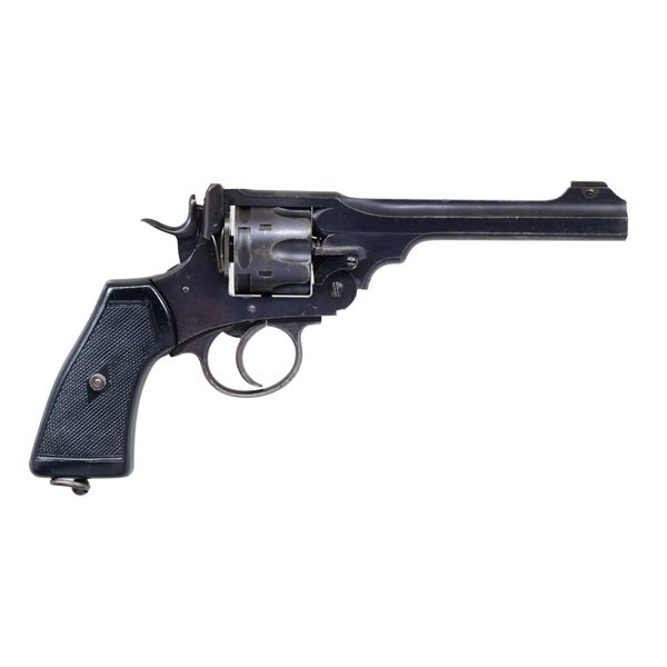 Cal. 455 Webley. S# 166336. Bbl.6". Blade front sight. V-notch rear sight. All matching numbers. Cyl. has been shaved for 45 ACP/AR ammo. 1915 dated Webley MKVI revolver. Parts have various British military inspection stamps such as Broad Arrows but revolver lacks British sale proofs. Arsenal blue finish. Checkered brown grips. Lanyard ring present on bottom of grip frame. UNATTACHED ACCESSORIES: aftermarket black hardcase with unmarked brown leather holster. CONDITION: grips show heavy handling wear with some worn checkering. Metal retains 60% arsenal blue with scattered fading to gray, edge wear, some light dings & oxidation spots. Action functions properly when hand cycled. Good bright bore with some light oxidation. (24-6900/MJC). CURIO. $350-550.