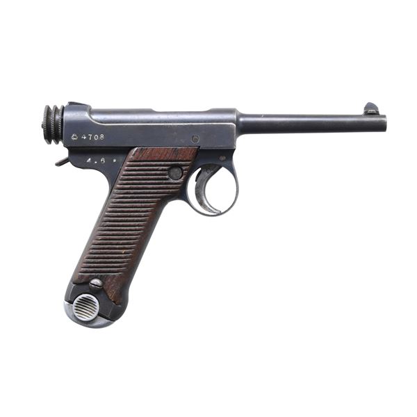 Cal. 8mm Nambu. S# 4708. Bbl. 4 3/4". Blade front sight. Fixed square notch rear sight. Matching numbers on slide & cocking piece. Bolt is numbered "715" possibly an assembly number. Firing pin & extension are unnumbered. Right rear of slide has Tokyo arsenal symbol & serial number. Right rear of frame has "4.6" Showa date for June, 1929. Markings have added white highlight paint. Blued finish with strawed small parts. Grooved Asian hardwood grips. MAGS: 2-8 rd. both nickel finished & numbered to different pistols. UNATTACHED ACCESSORIES: leather clamshell holster with cleaning rod & spare firing pin. CONDITION: grips show some dings & handling wear. Metal shows overall fading to gray with several slash marks on front of trigger guard, scattered oxidation & pitting. Action appears to function properly when hand cycled. Worn bore with scattered oxidation. (24-6996/MJC). CURIO. $600-900.