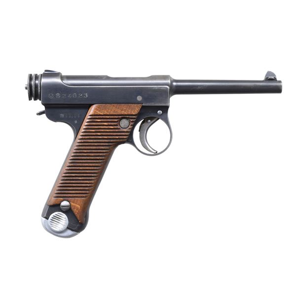Cal. 8mm Nambu. S# 24023. Bbl. 4 3/4". Blade front sight. Fixed square notch rear sight. Matching numbers on slide, trigger, bolt & cocking piece. Firing pin & extension appear unnumbered. Rear right of slide has Nagoya & Chuo Kogyo markings with serial number. Right rear of frame has "11.11" Showa date for November, 1936. Blued finish with strawed small parts. Grooved Asian hardwood grips. MAGS: 2-8 rd. both nickel finished & mismatched. UNATTACHED ACCESSORIES: leather clamshell holster with cleaning rod. CONDITION: grips show a few dings & scattered handling marks. Metal retains 60% original blue with scattered edge wear, fading to gray, light oxidation & a couple spots of light pitting. Action functions properly when hand cycled. Very good bore. (24-6994/MJC). CURIO. $600-900.