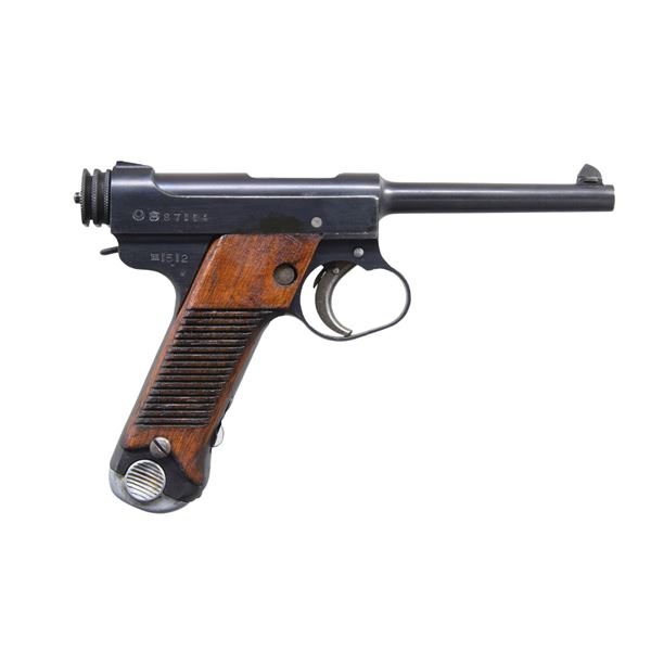 Cal. 8mm Nambu. S# 87114. Bbl. 4 3/4". Blade front sight. Fixed rear sight. Matching numbers on slide, trigger, bolt, cocking piece & mag. Firing pin & extension are unnumbered. Right rear of slide has Nagoya, Chuo Kogyo symbols & serial number. Right rear of frame has "15.12" Showa date for December, 1940. blued finish with strawed small aprts. Grooved Asian hardwood grips. MAGS: 2-8 rd. one matching & other mismatched. UNATTACHED ACCESSORIES: rubberized canvas clamshell holster with cleaning rod & spare unnumbered firing pin. CONDITION: grips show some remnants of old added finish & some handling marks Metal retains 90% original blue with some oil staining, scattered edge wear, light oxidation & fading to brown. Action functions properly when hand cycled. Very good + bright bore. (24-7003/MJC). CURIO. $600-900.