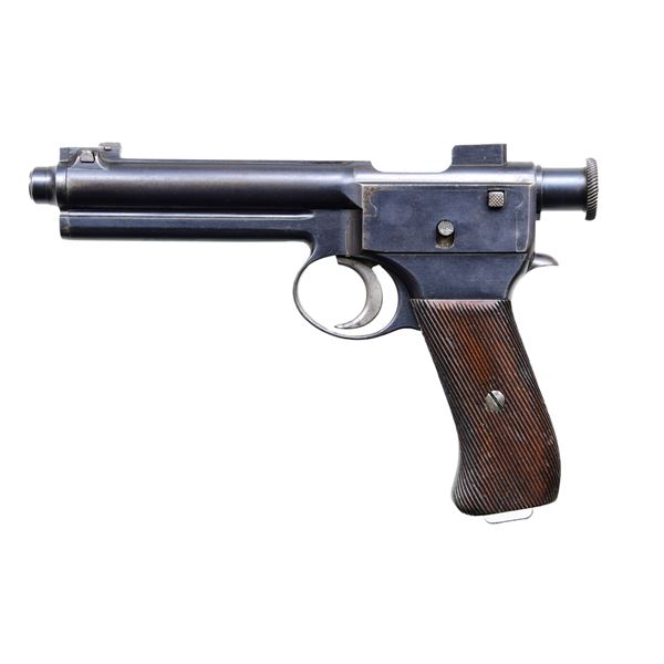SEMI-AUTOMATIC PISTOL. Cal. 8mm Steyr. S# 35159. Bbl. 5 1/4". Model 1907 Roth-Steyr semi-automatic pistol mfg. by Steyr. Top of the solid bbl. rib is marked "WAFFENFABRIK STEYR". Right side of the frame is marked with the S#, with an Austrian 1910 acceptance proof "W-n (AUSTRIAN EAGLE) 10" stamped on the rear. Frame exhibits a blue finish overall, with the bolt, firing pin, and bbl. being polished in-the-white. Extractor and trigger exhibit a straw finish. Frame is mounted with 2-piece grooved wood grips, with the right panel exhibiting an Austrian "22.LFH/ 22" unit mark, which appears to indicate issue to the Landwehr Feldhaubitzdivision (Howtizer Division). Dovetailed blade front sight, with fixed V-notch rear side of stripper clip feed lips. Matching numbers are present on the frame, as well as on the interior of the left sideplate. CONDITION: metal components retain the majority of their original arsenal blue finish, exhibiting areas of wear and thinning that show through to gray and brown patinas, as well as scattered spots of light to mild surface oxidation and pitting overall. Extractor retains good amounts of its original straw finish. Trigger retains scant traces of its original straw finish, with the balance exhibiting a gray patina. Bore exhibits moderate degrees of dark pitting, while retaining well defined rifling throughout. Grips show some superficial marks and impressions from handling and storage, but otherwise remain sturdy and serviceable. (24-6854/MLW). CURIO. $1,000-1,500.