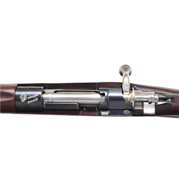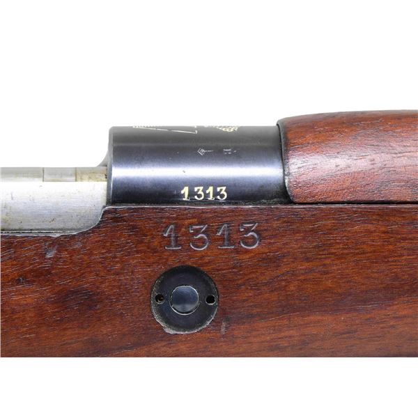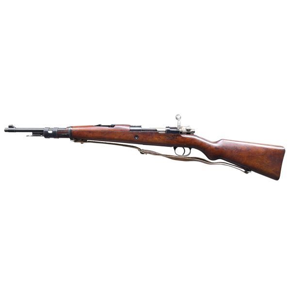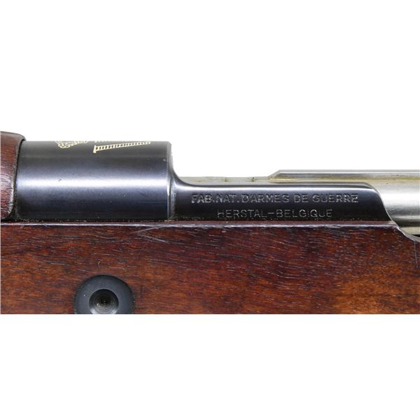 POLICE CARBINE. Cal. 8x57 Mauser. S# 1313. All visible numbers match. Bbl. 17 3/8". Carbine is marked on top of the receiver ring with the crown "W." Marked on the right side with Belgian proofs. Left receiver rail is marked "FAB. NAT. D'ARMES DE GUERRE HERSTAL-BELGIQUE"; markings have been enhanced with white. Tangent rear sight, graduated to 1400 meters; inverted V front sight. Bright bolt assembly with turned-down bolt handle. Cleaning rod and bayonet bar are present. Walnut stock set. Buttstock is marked only with the serial number on the right side. Bottom swivels. Tan military sling with brass slide. UNATTACHED ACCESSORIES: German M98-K bayonet with 9 7/8" fullered blade. Blade is marked on the left ricasso "43asw." Pommel is marked with two "WAA51?." Smooth walnut grips retained by two screws. Matching steel scabbard. Bayonet has arsenal reblue finish with thinning and wear; the date has been removed from the top of the blade. Non-matching grips have light wear and staining. Scabbard has traces of blue turning gray in patina. CONDITION: stock set has a very good appearance, with light wear and scattered handling marks. Metal with light wear retains 80% of its original blue, including fire blue on the bolt stop. Crest has a sharp, crisp appearance. Bright, shiny bore with sharp lands. PROVENANCE: the Estate Collection of Charles Wagner. (24-4614/RW). CURIO. $1,000-1,500.