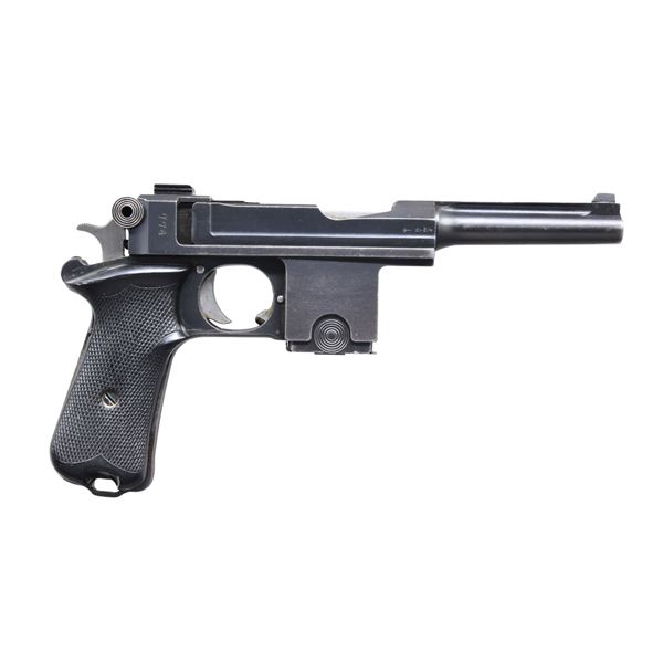 BERMANN BAYARD SEMI-AUTOMATIC PISTOL WITH HOLSTER. Cal. 9mm Bergmann. S# 6852. Bbl. 4". Model 1910 Bergmann Bayard semi-automatic pistol mfg. in Belgium by Anciens Etablissements Pieper under contract for Denmark. Left side of the bbl. extension is marked "BREVETE./ S.G.D.G.", followed by ANCIENS ETABLISSEMENTS PIEPER./ HERSTAL-LIEGE./ BERGMANN'S PATENT.", with Belgian commercial proofs marked on the right. Right side of the frame is marked with the Danish army S# "774", with the full factory S# "6852" marked on the underside. Frame and bbl. / bbl. extension exhibit a rust blue finish, with the trigger and mag. release exhibiting a straw finish. Bolt, firing pin, locking block, and hammer are polished in-the-white. Frame is mounted with 2-piece checkered black Trolit grips. Fixed blade front sight, with fixed V-notch rear sight. All serialized parts are matching and include the frame, bbl. / bbl. extension, bolt, firing pin, locking block, rear sight, as well as the firing pin retention pin. MAGS: 1 unnumbered 6-rd. UNATTACHED ACCESSORIES: unmarked Danish pattern black leather holster. Provisions for spare mags./ammunition have been removed, with body having been cut down on the interior beneath the closure flap. CONDITION: metal components retain the majority of their original or period arsenal blue finish, exhibiting some areas of light to mild wear and thinning that show through to gray patina, some superficial marks from handling and storage, as well as some spots/areas of light surface oxidation. Strawed parts retain traces of their original finish. In-the-white parts show some scattered spots of light age related discoloration. Very bright bore, exhibiting consistent light pitting, while retaining well defined rifling throughout. Grips show smoothing and some scattered marks from handling and storage, but otherwise remain sturdy and serviceable. Holster remains malleable, exhibiting wear and scattered handling marks, as well as varying degrees of age related cracking and crazing overall. A nice early Danish contract Model 1910 Bergmann Bayard. (24-6975/MLW). CURIO. $2,000-3,000.