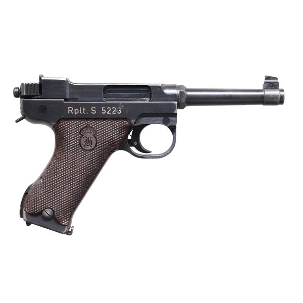 SEMI-AUTOMATIC PISTOL WITH HOLSTER. Cal. 9x19mm Parabellum. S# 68423. Bbl. 4 3/4". M/40 Lahti semi-automatic pistol mfg. in Sweden for the Danish Brigade and subsequently issued to Danish police after World War II. After the German invasion of Denmark in 1940, many Danish military personnel fled to Sweden. While in Sweden, these troops, deemed the "Danish Brigade", were trained and equipped to retake Denmark. Ultimately, the Danish Brigade was deployed on the same day of the German surrender of Denmark, and many weapons, such as this example, found their way into Danish police units. This example, falling within the appropriate S# range of 67000-69202, is marked "HUSQVARNA VAPENFABRIKS A.B." above the S# on the left side of the bbl. extension. Left side of the frame is marked with the S#, with the rear stamped with a Swedish Crown/S.S., indicating inspection by Captain Sten Stenmo ("S.S." also stamped on the interior of the bbl. extension), with a Danish police marking "Rplt. S 5223" on the right. Metal components exhibit a blue finish overall. Frame is mounted with 2-piece inverse checkered black plastic grips. All serialized parts are matching and include the frame and bbl. extension. MAGS: 2 8-rd. UNATTACHED ACCESSORIES: brown leather holster. CONDITION: very good, exhibiting some areas of light wear and thinning that show through to gray patina, as well as a few concentrated spots of mild to moderate pitting overall. Near mirror bore, exhibiting what appears to be several spots of either light surface oxidation or hardened grease, while retaining well defined rifling throughout. Grips are very good overall. Holster remains malleable, exhibiting wear overall, with some areas of crazing, but otherwise remains sturdy and serviceable. An extremely intriguing "Danish Brigade" M/40 Lahti pistol. (24-6492/MLW). CURIO. $900-1,300.