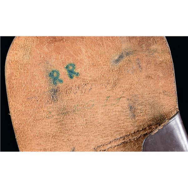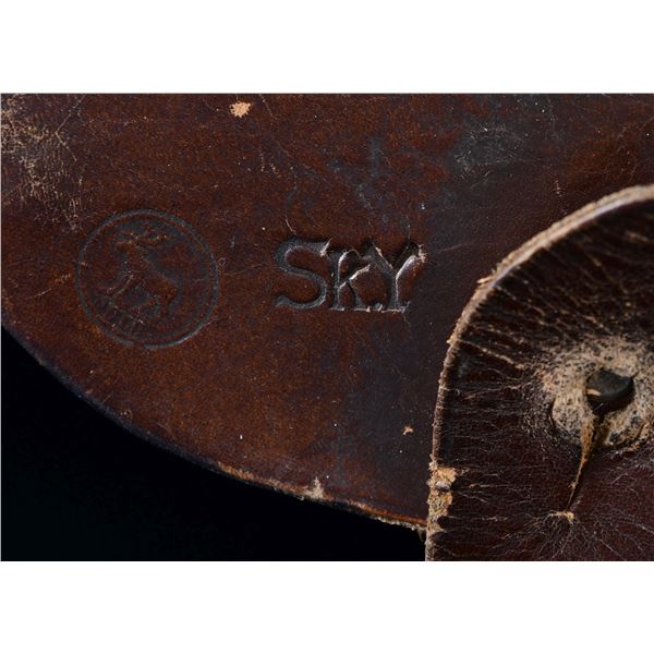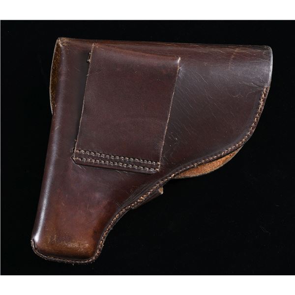 MODEL 1934 HOLSTER. 1 of only 500 leather M/34 holsters mfg. in Oulu, Finland by Veljekset Astrom Nahkatehdas for the Finnish Civil Guard. Brown leather construction, with steel closure flap stud. Closure flap is marked with a deer above "OULU" within a circle, followed by a Finnish Civil Guard "Sk.Y", below a Finnish army boxed "SA" (indicating subsequent Finnish army issue). This exact holster is pictured in figure 23-3 of "Holsters and Shoulder-Stocks of the World" by Anthony Vanderlinden. CONDITION: leather remains malleable, exhibiting some areas of wear and some scattered marks from handling and storage, with scattered areas of age related cracking and crazing (primarily present on the closure flap and mag. pouch). A very nice example of an extremely scarce and documented Finnish mfg. Beretta 1934 holster. PROVENANCE: the Estate Collection of Charles Wagner. (02-24303/MLW). $1,000-1,500.